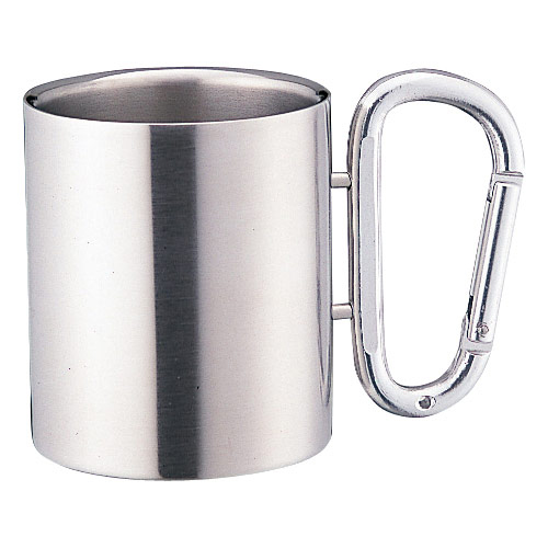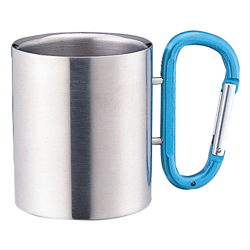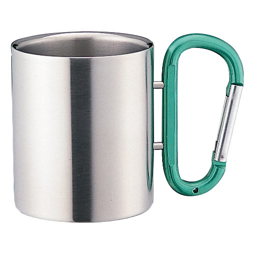 取っ手がカラビナになったユニークなカップ。ザックなどに直接取り付け出来ます。