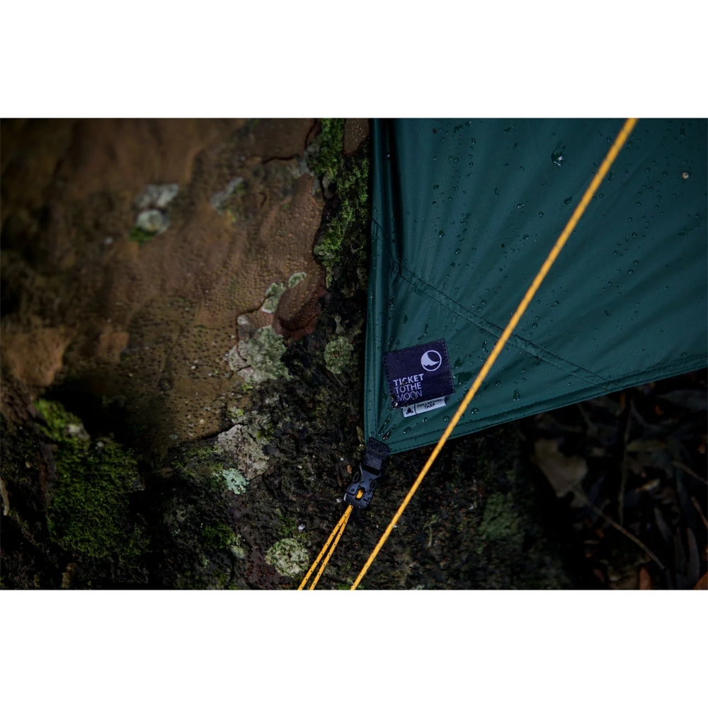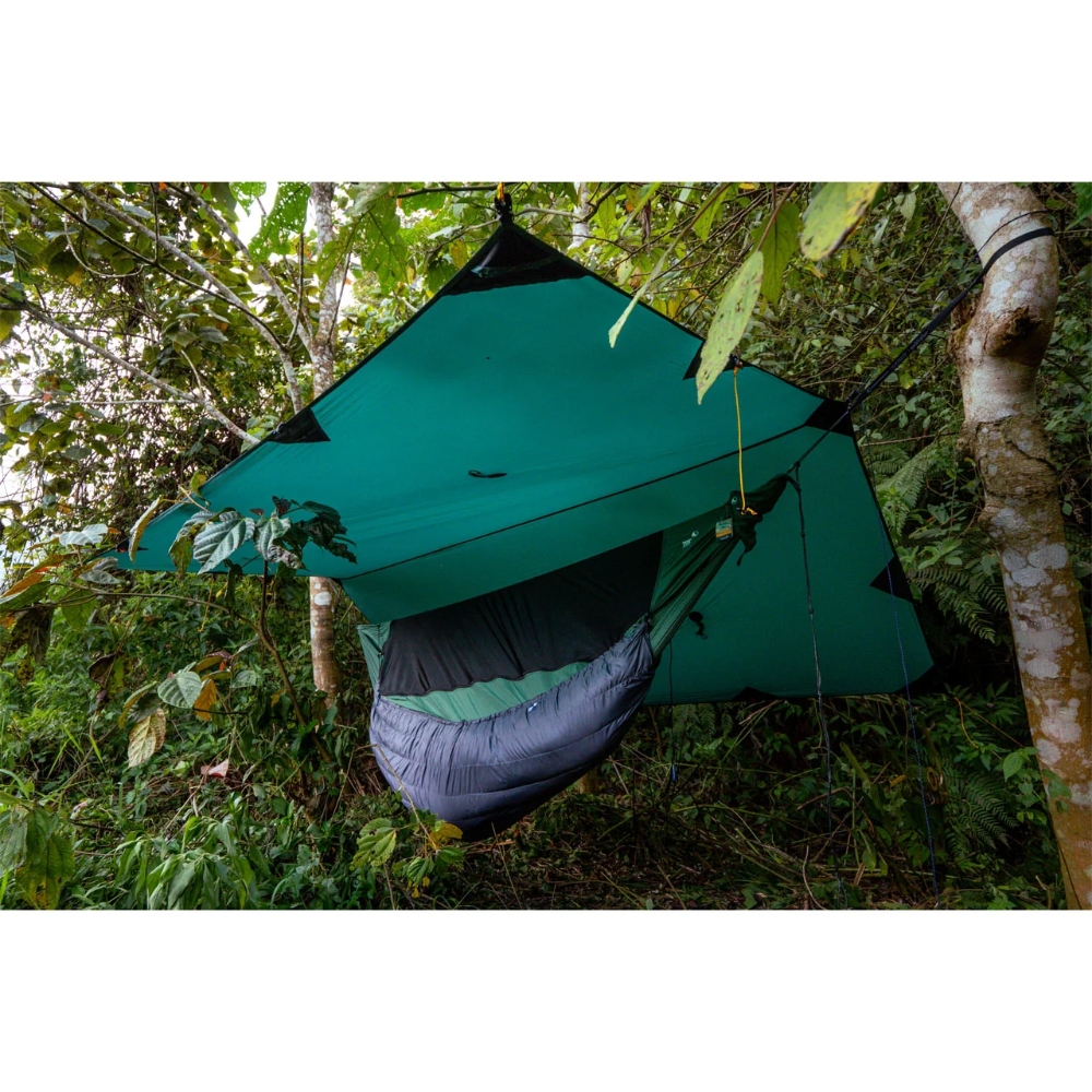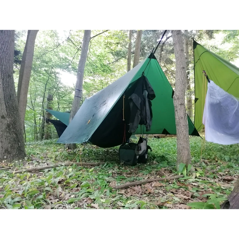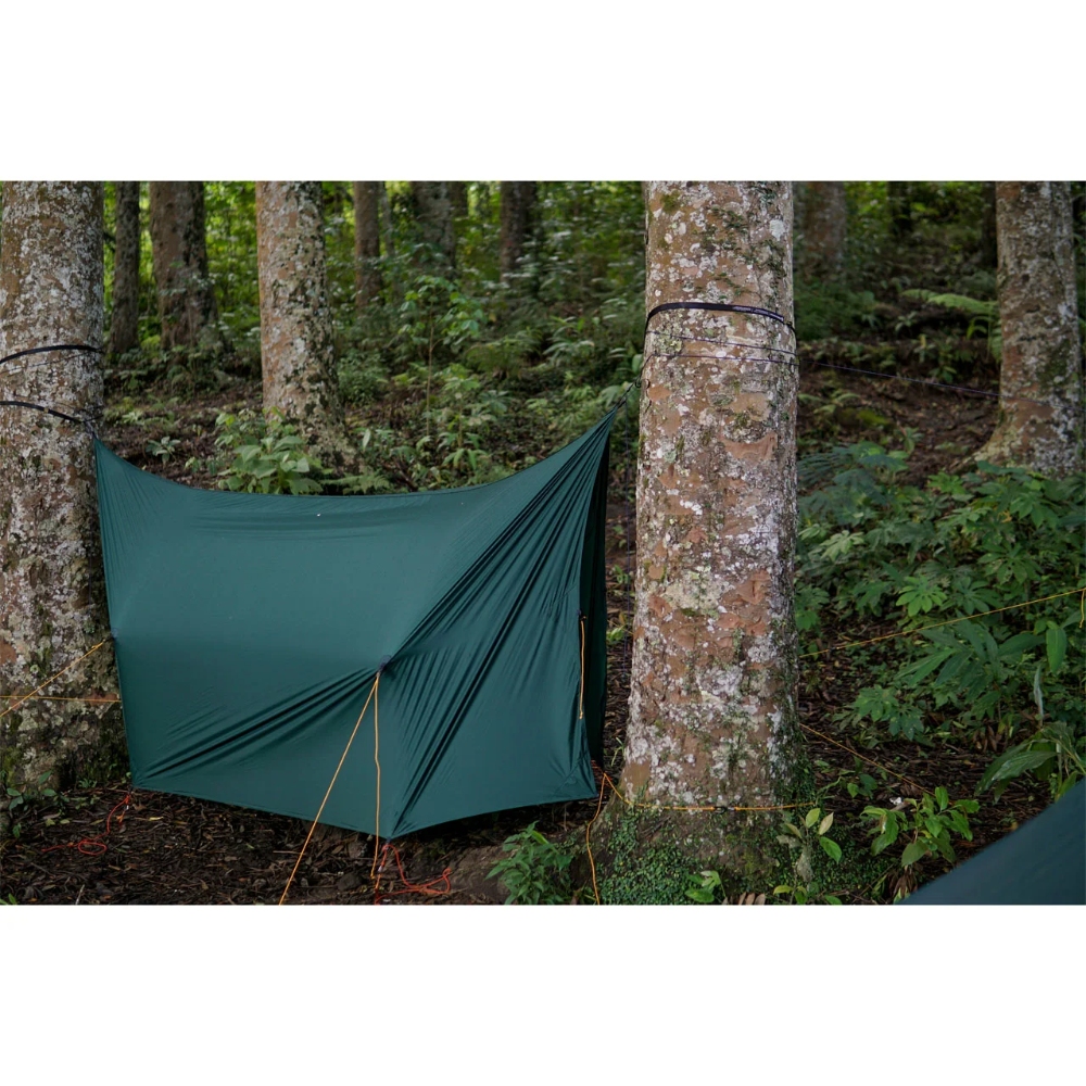 一枚に広げて屋根にしたり、Aフレームテントのようなシェルター型に張ったりと、工夫次第でさまざまな設営が可能です。