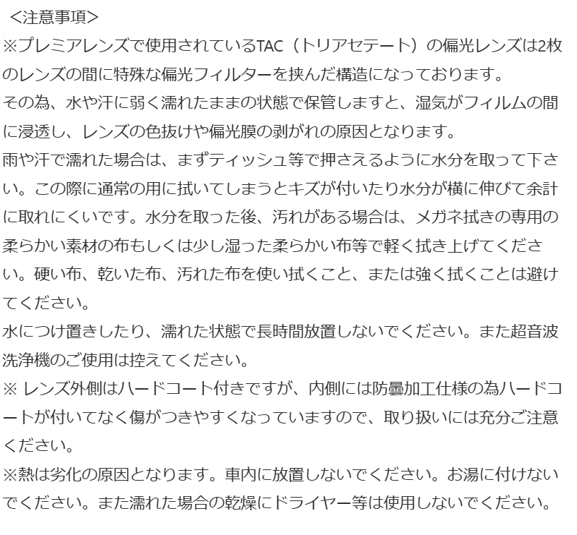 福井県鯖江市で生産された高品質かつ多機能な日本製偏光レンズ。半永久曇り止め加工、偏光度99%、ブルーライトカットといった機能が揃っています。