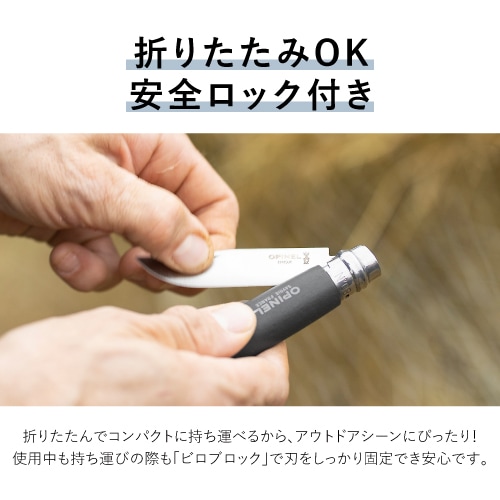 OPINEL独自の安全ロック機構であるビロブロック(R)は、シンプルな構造でありながらロックの確実性が高いことが特徴です。