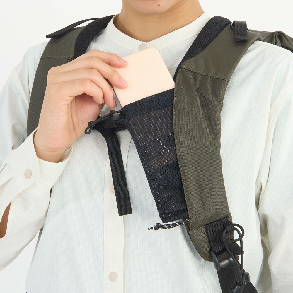・ショルダーハーネスに携帯などの小物を収納可能な格納式ポケット
