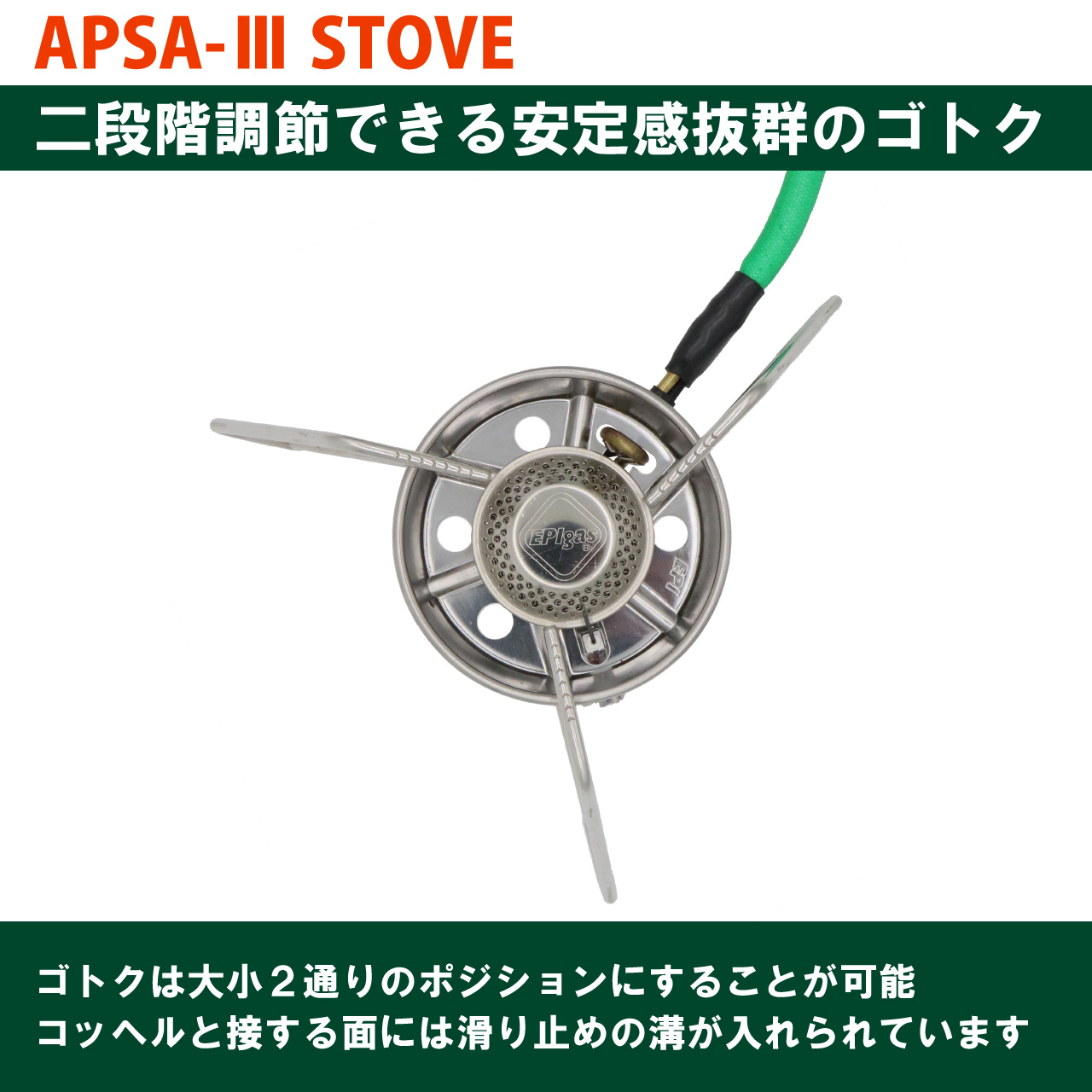 低い重心設定と、2段階調節が可能なゴトク(径)により抜群の安定感を備えた分離型ストーブ。自動点火スイッチが手元にあるので安心して操作ができます。