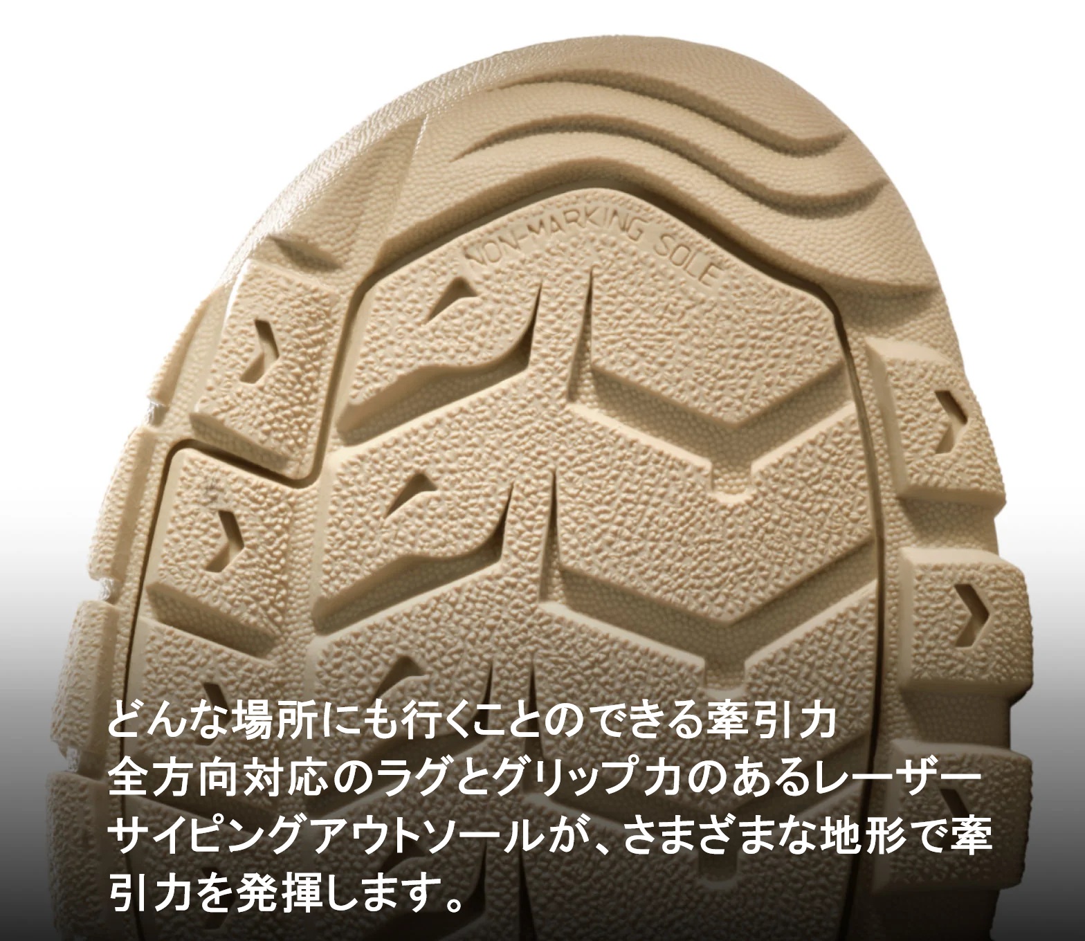 ・地面に汚れやラバー跡を残さないノンマーキング加工のラバーアウトソールを採用