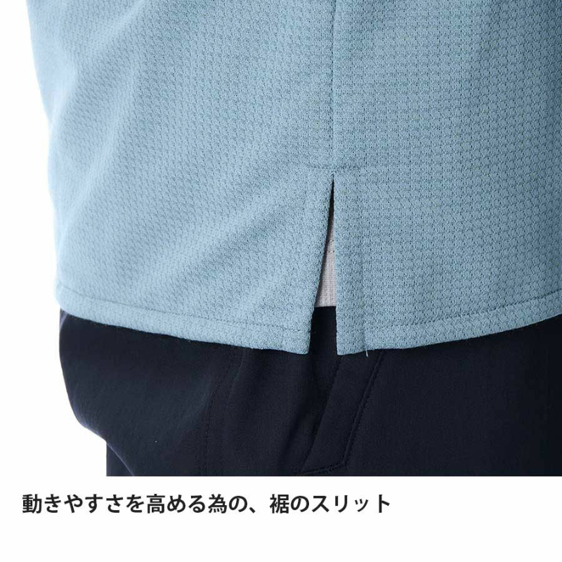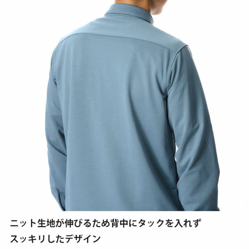 シャツとして一般的な布帛を使わず、ニット地にすることで高い通気性と動きやすさを実現しました。ニット素材には独自素材のラミースピン(R)糸と半永久吸汗を可能にする特殊ポリエステルをハイブリッドし、ベースレイヤー並みの優れた吸汗速乾性も備えます。