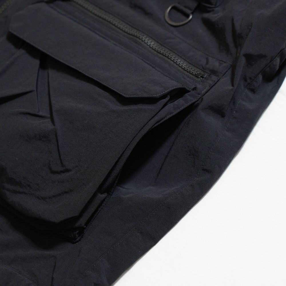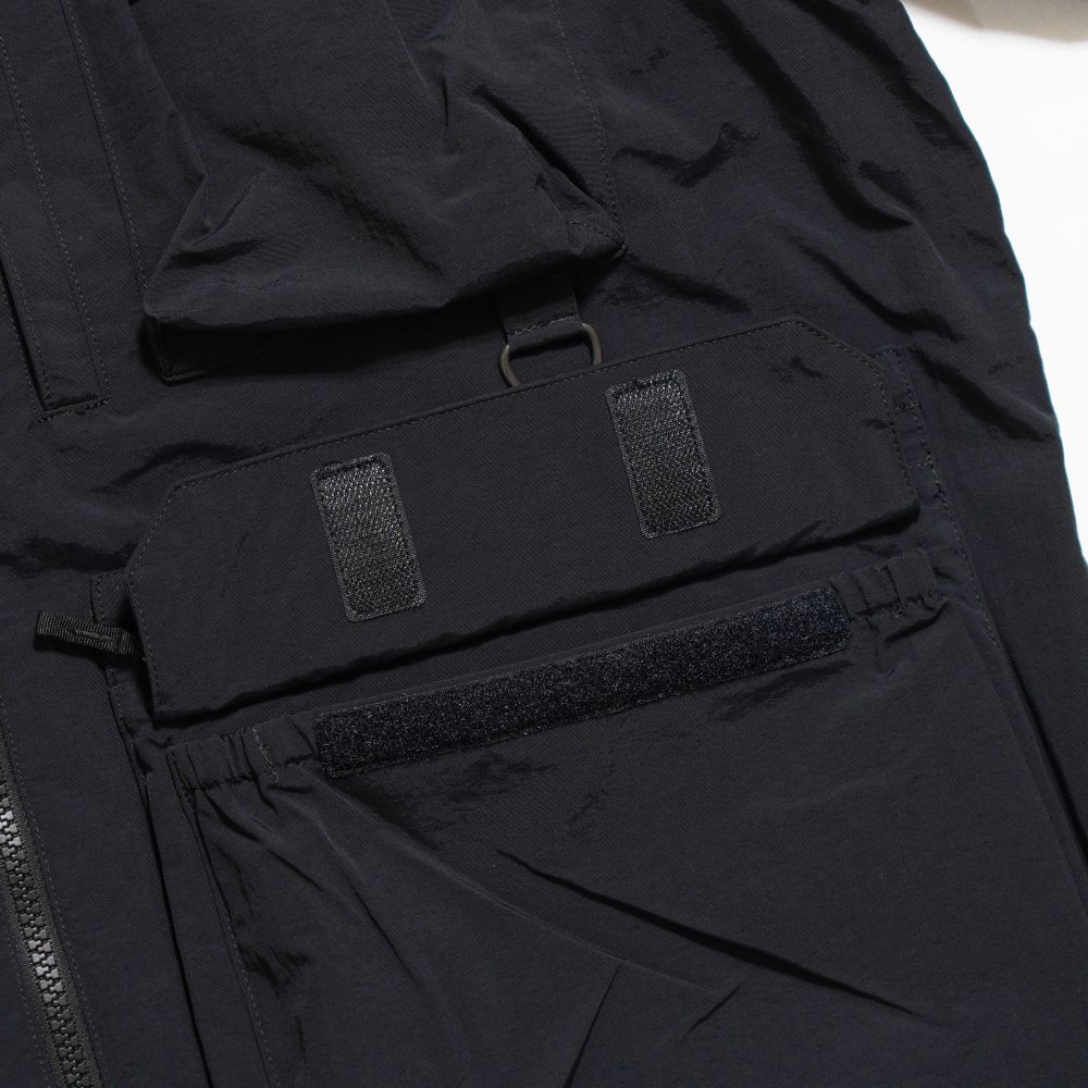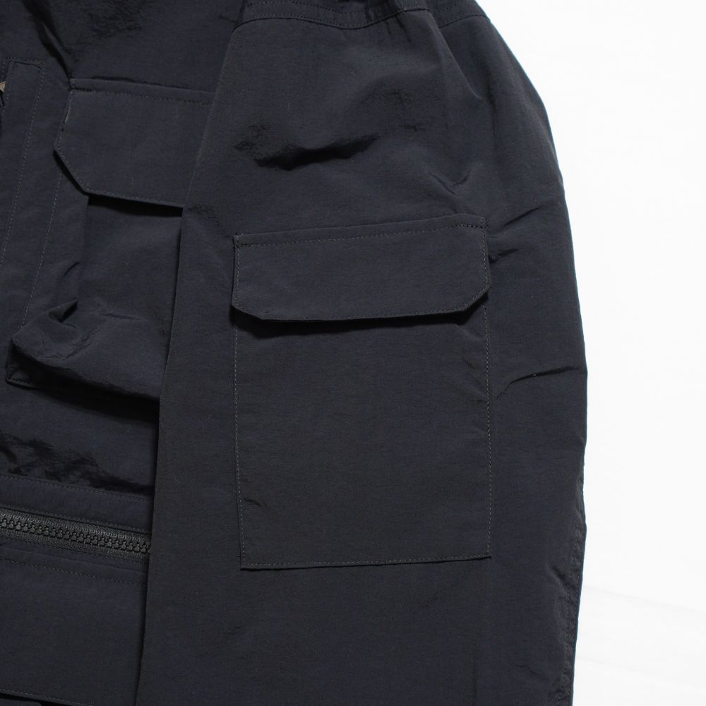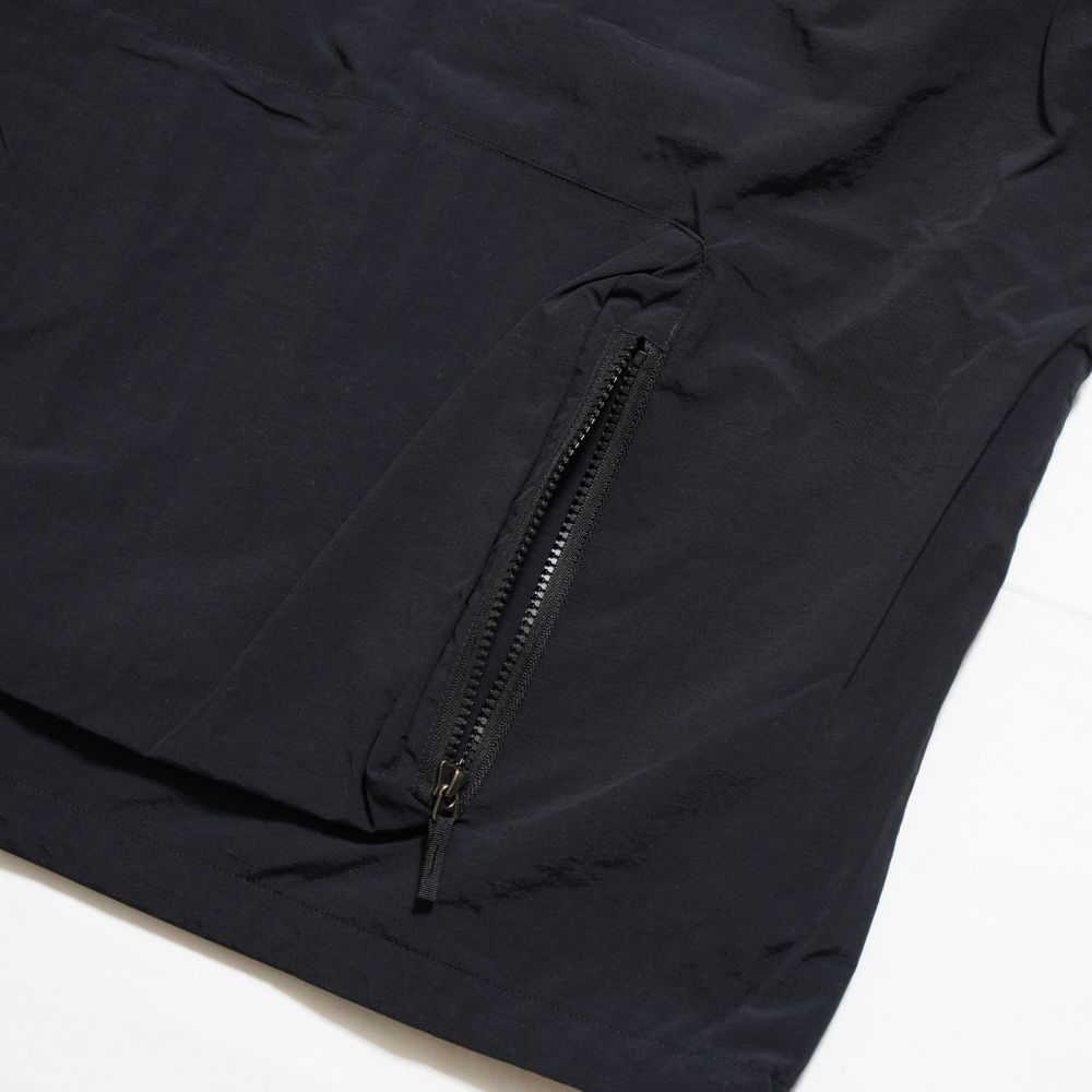 表地はコットンライクな表情のタスランナイロンを使用。フッ素化合物を含まないはっ水剤を使用したはっ水加工を施しており、多少の雨や汚れに対応します。裏地は肌離れのよいポリエステルメッシュ。大容量のマチ付きポケットは、中身が落ちにくいように面ファスナー式のフラップ付き。右胸のハーフドーム型ファスナーポケットは、貴重品の収納に便利です。背面にも大容量のマチ付きポケットを配置。襟にフードを収納できるビルトインフード仕様です。