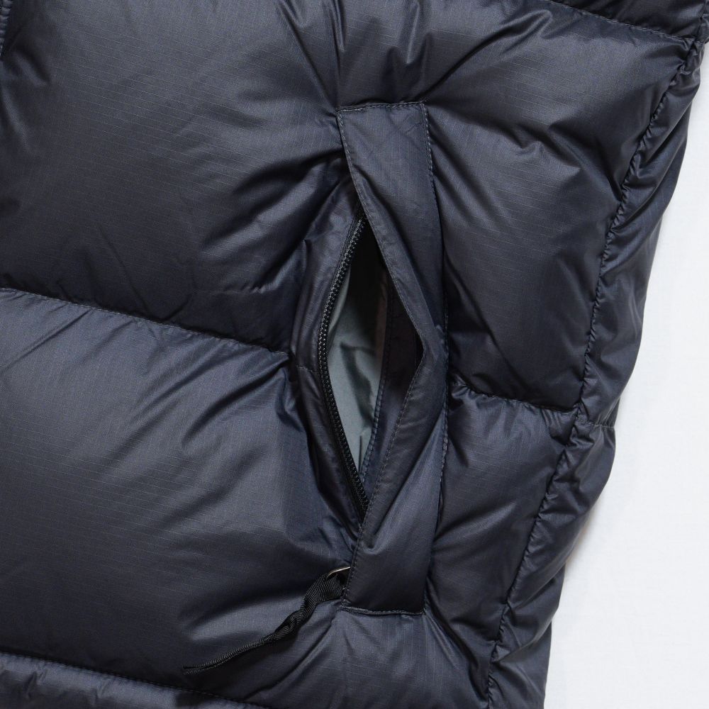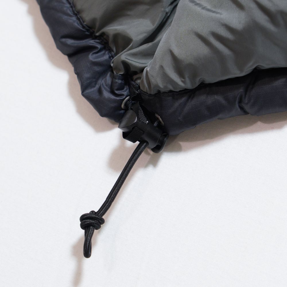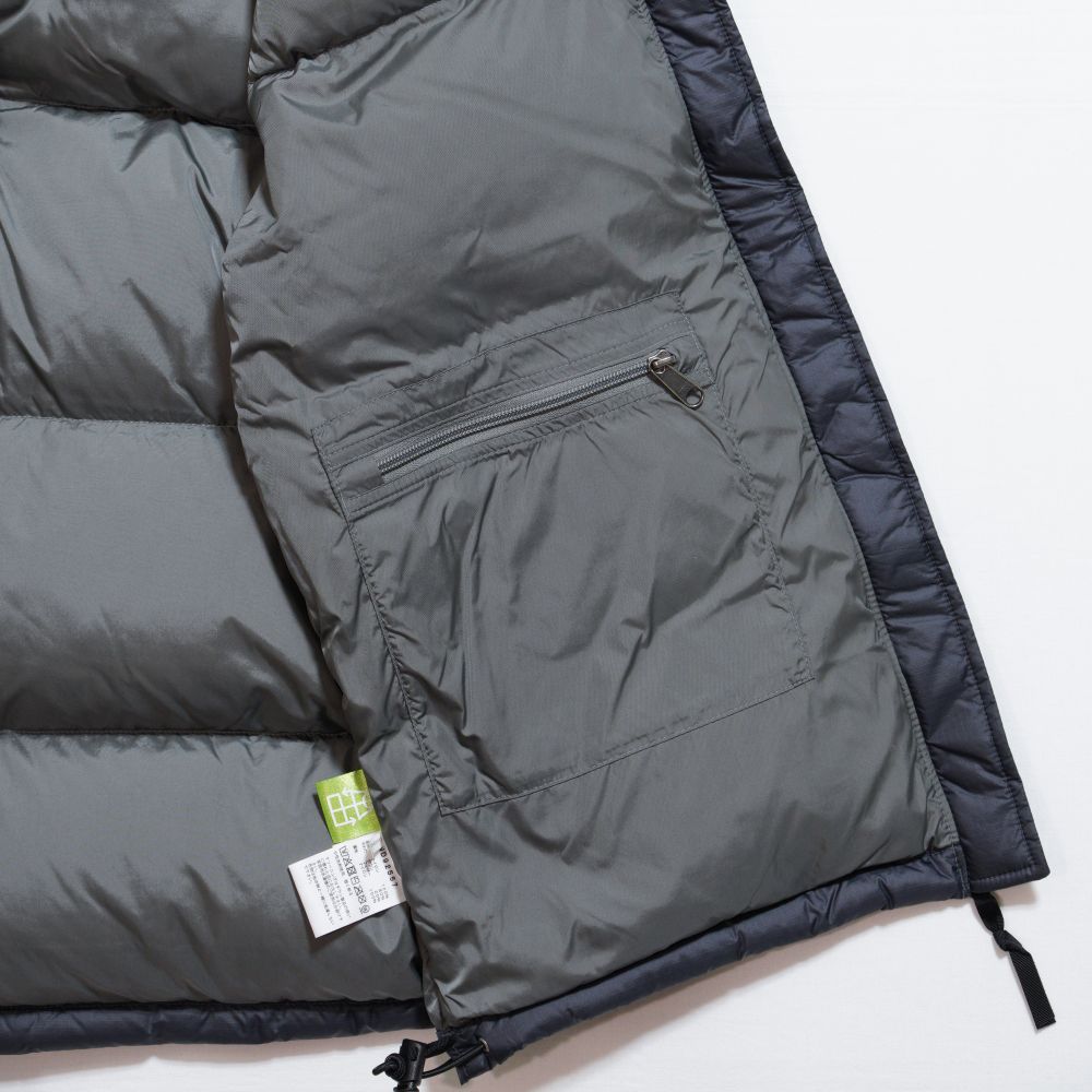 環境に配慮したリサイクルダウンを中わたの一部に使用。表地は強度がある40デニールのリップストップナイロンにはっ水加工を施し、肩切り替え部分は厚手のナイロン素材に切り替えています。