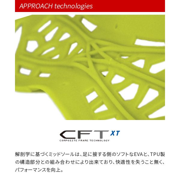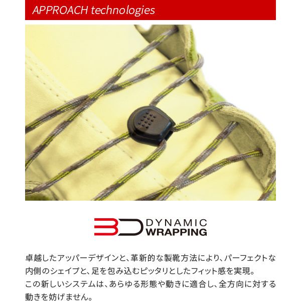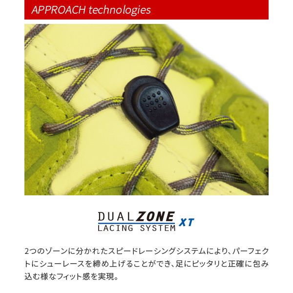 シューレースの前後部の2つのゾーンで違う締め上げ方が出来るシステムを採用し、あらゆる地形にて快適なフィット感を調整できる