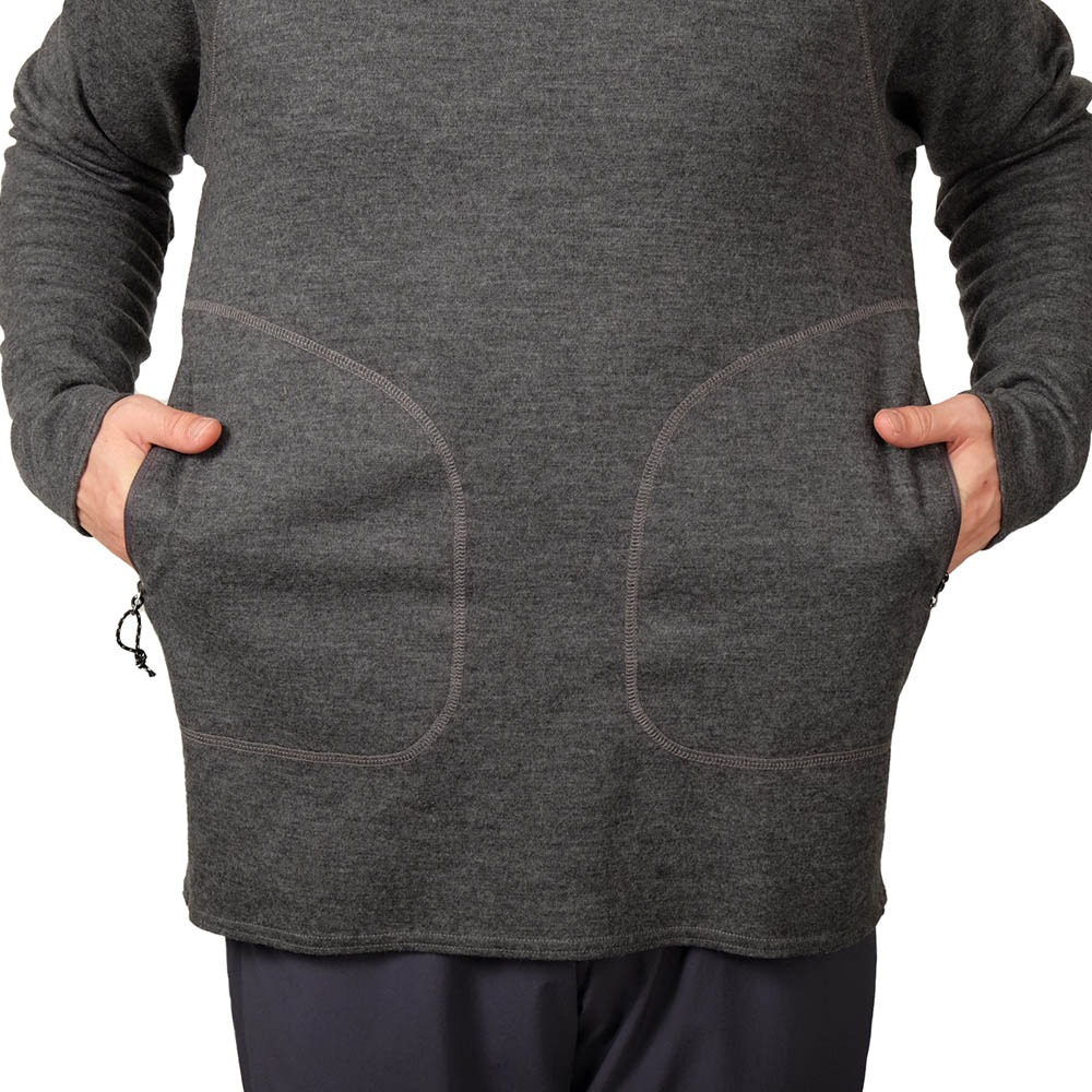 レイヤードによるごろつきをなくすためにラグランスリーブを採用し、バックパックのヒップベルトの干渉をなくすためにポケット位置を少し高く、そして裾回りはドローコードとコードロックをなくしてすっきり仕上げています。