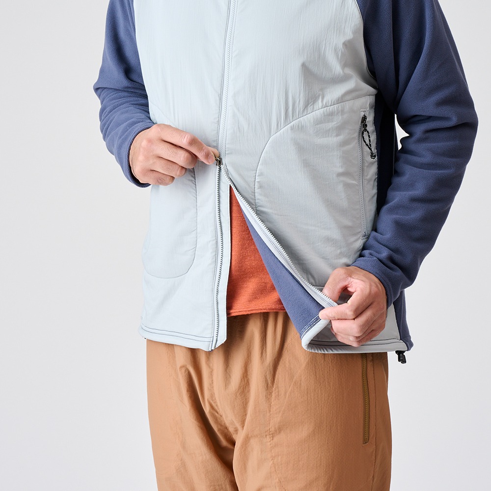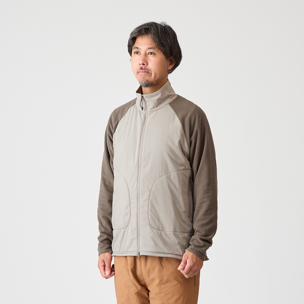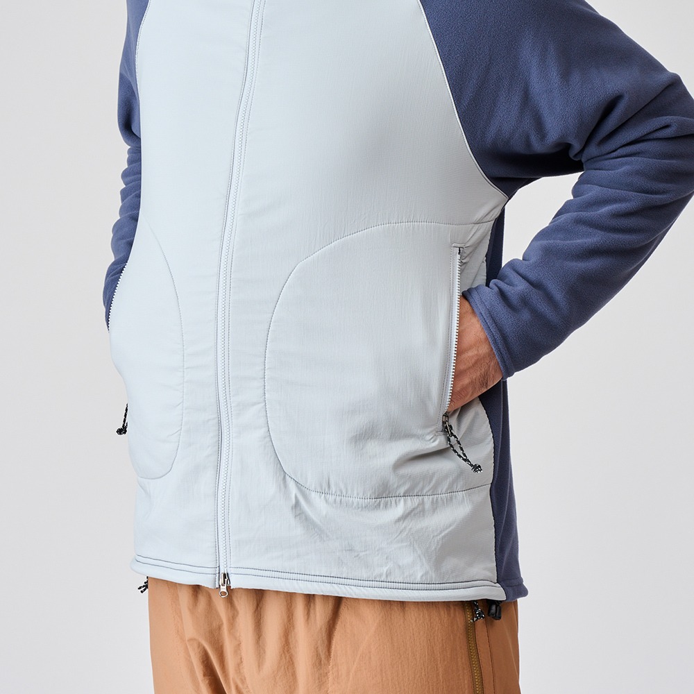 ・衿と前身頃に高通気シェルをレイヤードしたフリースジャケット