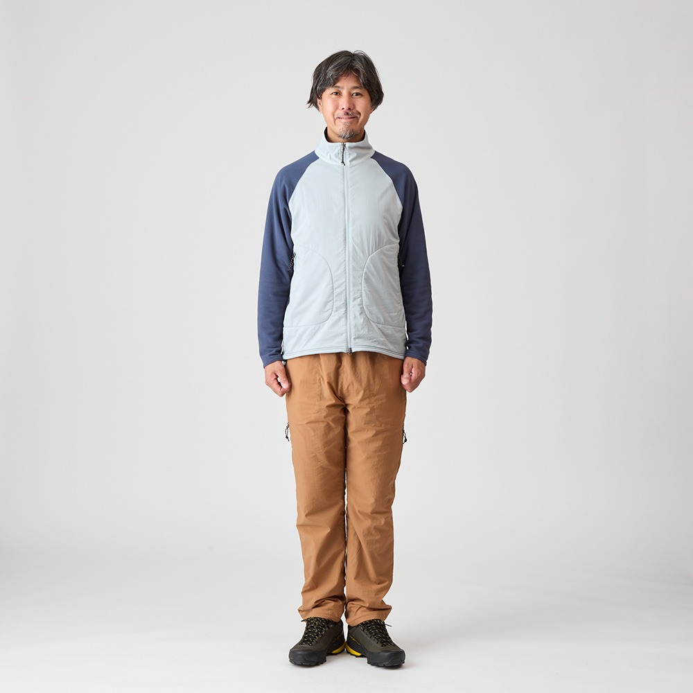 レイヤードしやすいスタンドカラーを採用し、ポケットはバックパックのヒップベルトに干渉しないように少し高い位置に配置しています。