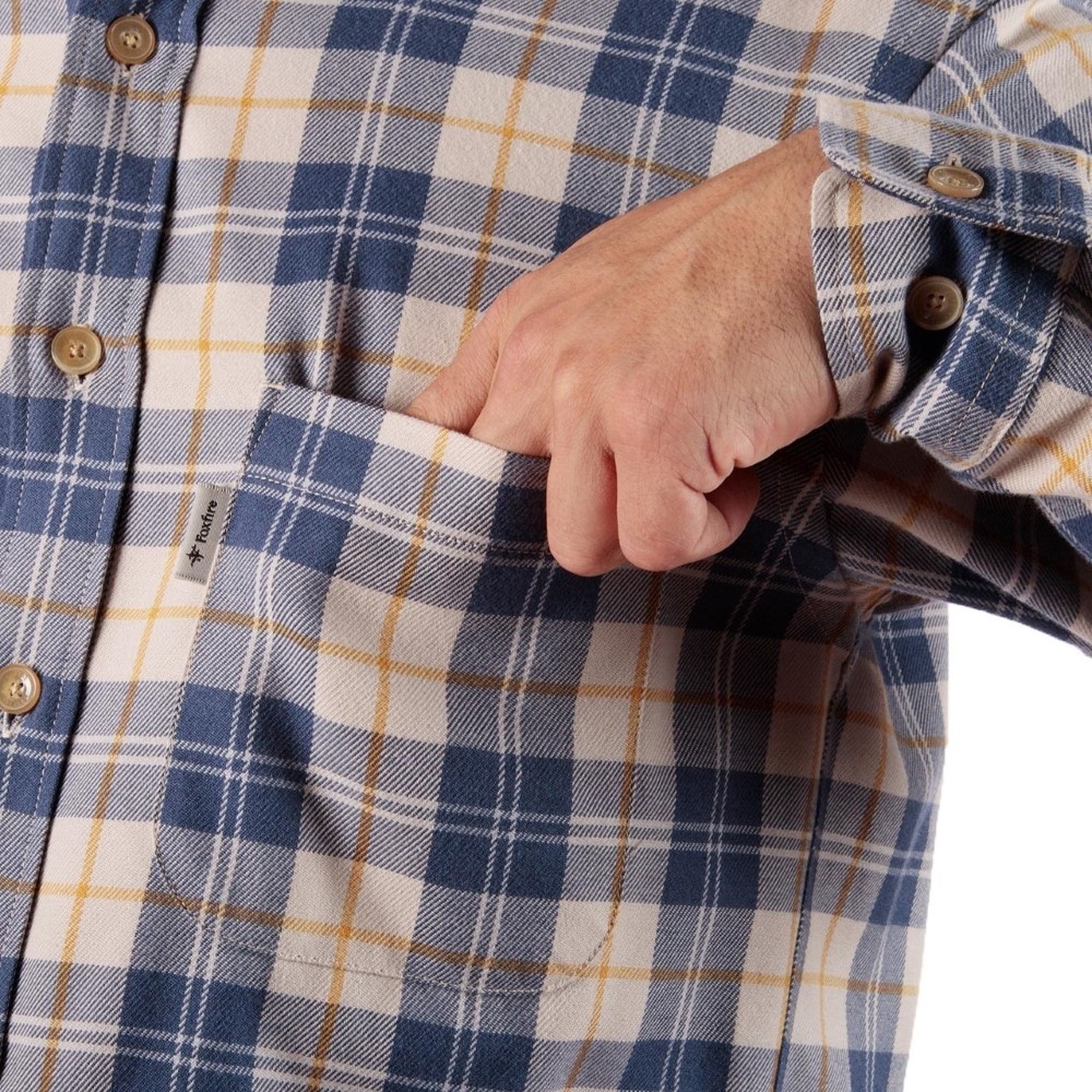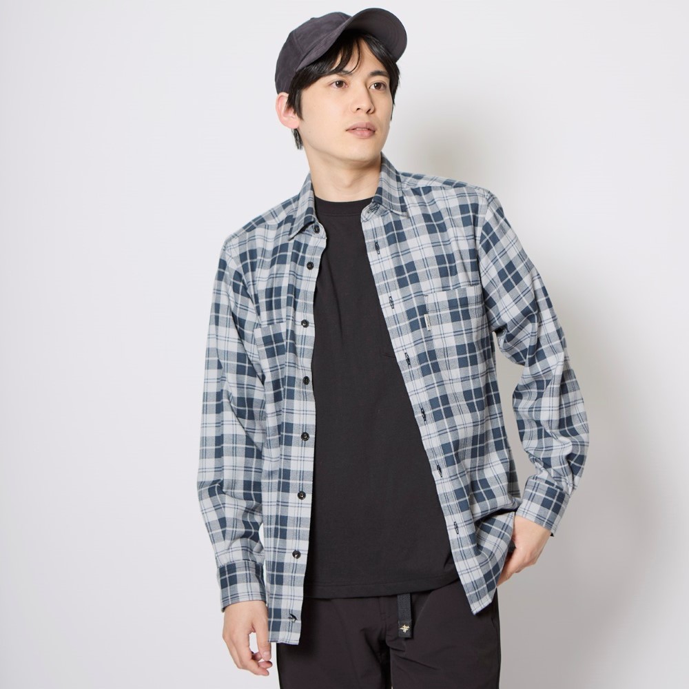 - 微起毛した吸汗速乾素材トランスウェットサーマルを使用した中厚タイプのチェックシャツ。杢調で温かみのあるチェック柄が特徴です。下前立てに毛ばり柄のワンポイント刺しゅう入り。
