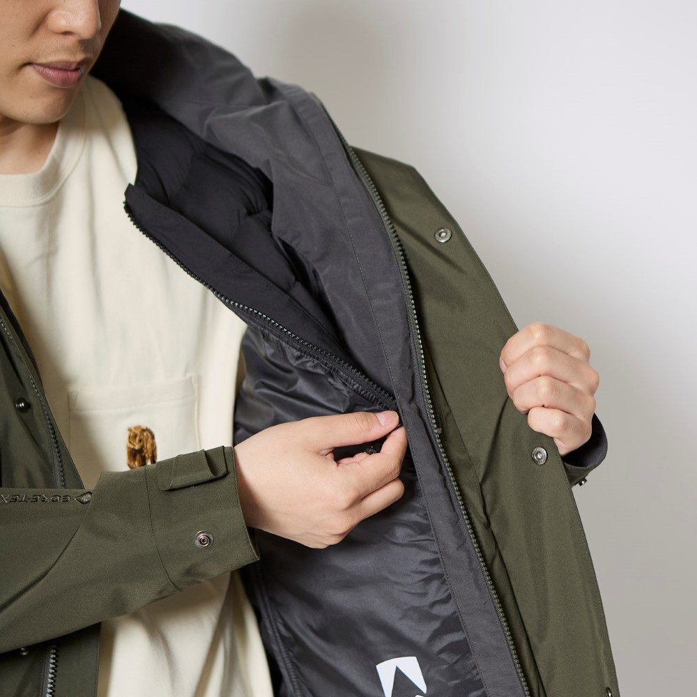- 透湿防水性に優れた全天候型ゴアテックスジャケット。クラシカルなフィールドジャケットをベースに適度なアーバンアレンジを加えたデザインです。フードは取り外し式で、アウトドアからタウンユースまでさまざまなシーンで活躍し、スーツの上にハーフコートとしても着用可能です。表地は軽量ポリエステル、裏地は総裏仕立てで、スマートで軽い着心地。表6個(ハンドウォーマー2個含)、内1個、合計7個のポケットを装備しています。
