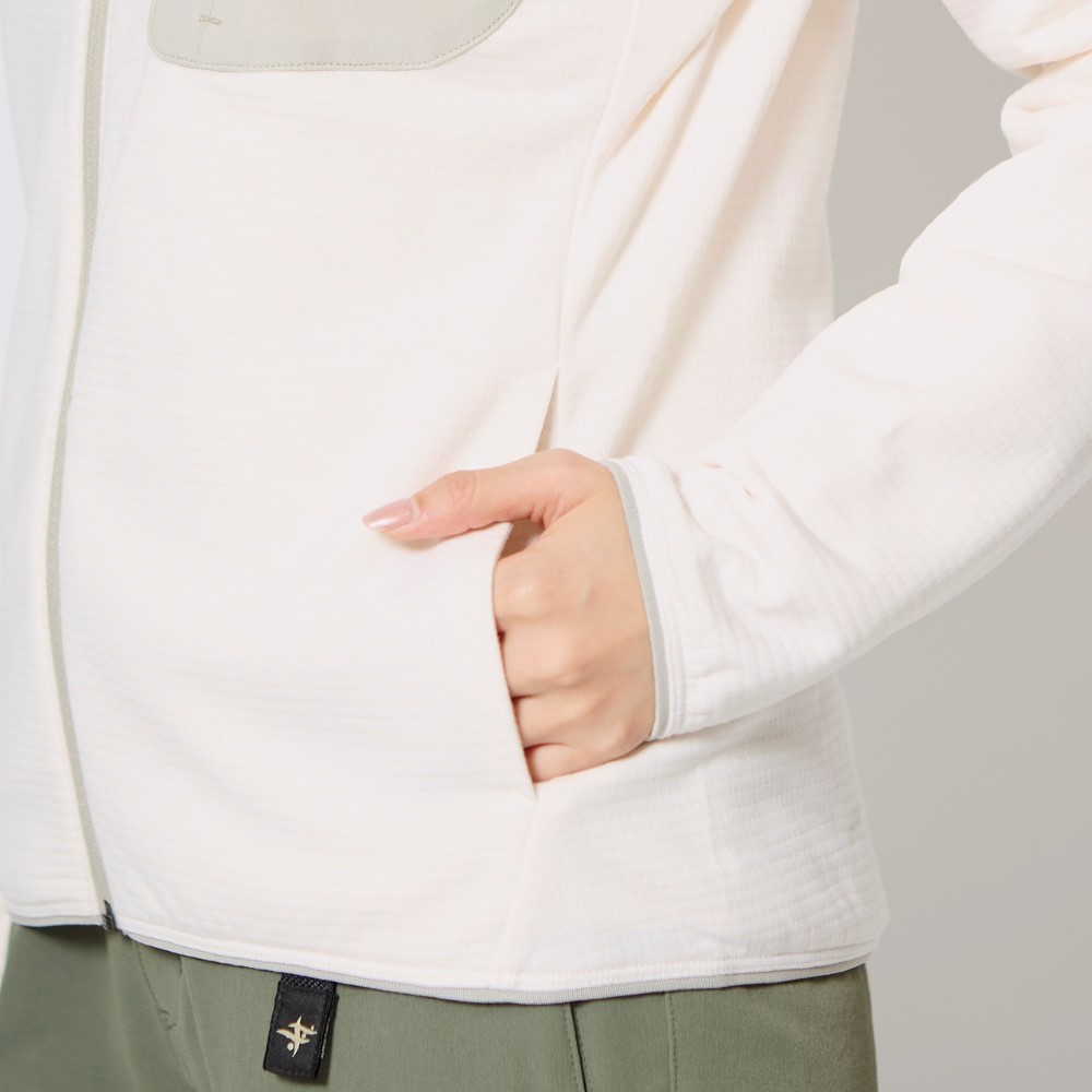 - メリノウールを立体ブロック状に編み込んだグリッド構造が、ウールの優れた性質をアウトドアシーンに最適化。保温性に加えて、通気性や軽さ、伸びのある着心地が特徴のフルジップカットソーです。左胸に別素材でファスナー付ポケットを配置。ミッドレイヤーからアウターとして着用可能です。
