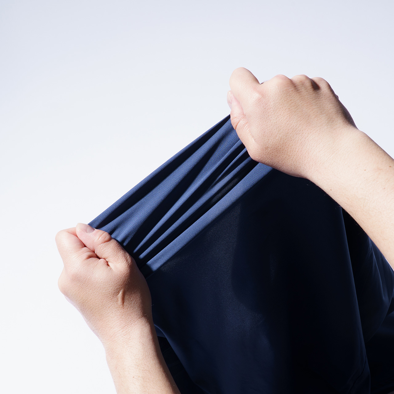 シワになりにくく、コンパクトに収納できるので、羽織物としての携行にも便利です。