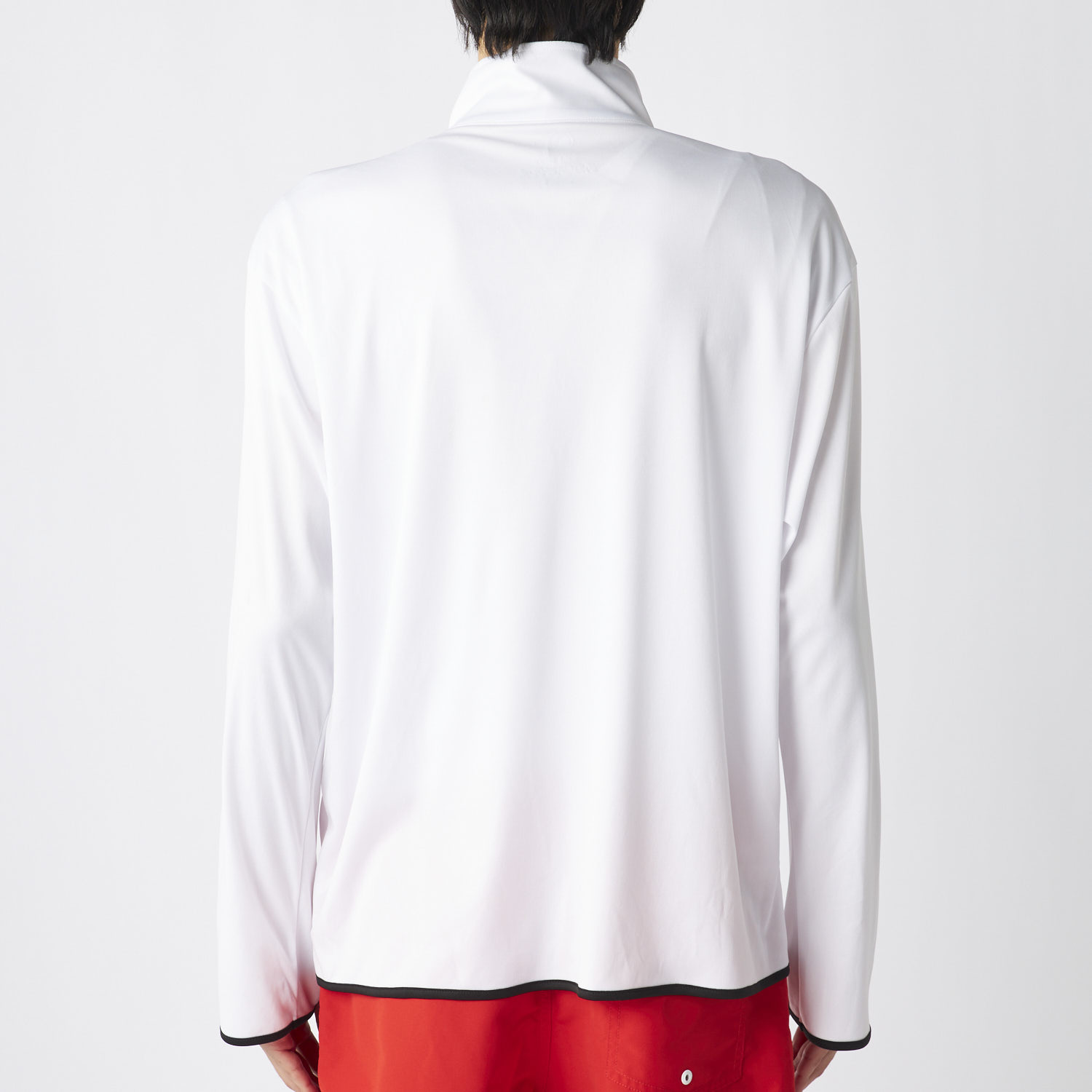 - 海やプールなどの水回りは勿論、日常でも使いやすいシンプルなデザイン。左胸、左袖にはブランドロゴ、バインダーはバイカラーとシンプルなデザインの中にもアクセントがあります。また、実用性も兼ね備え前身にはポケット付き。脱ぎ着がしやすいフルジップタイプ。首元まで隠れる衿高スタンドネック。袖口には指穴通しもありめくれ上がり防止。