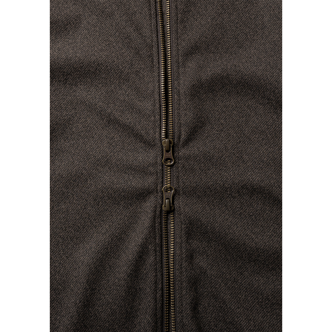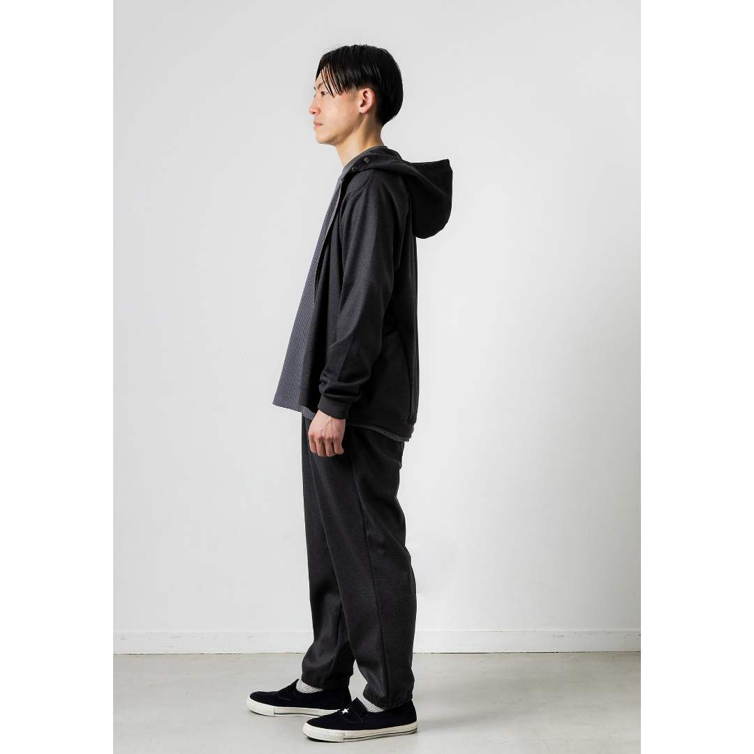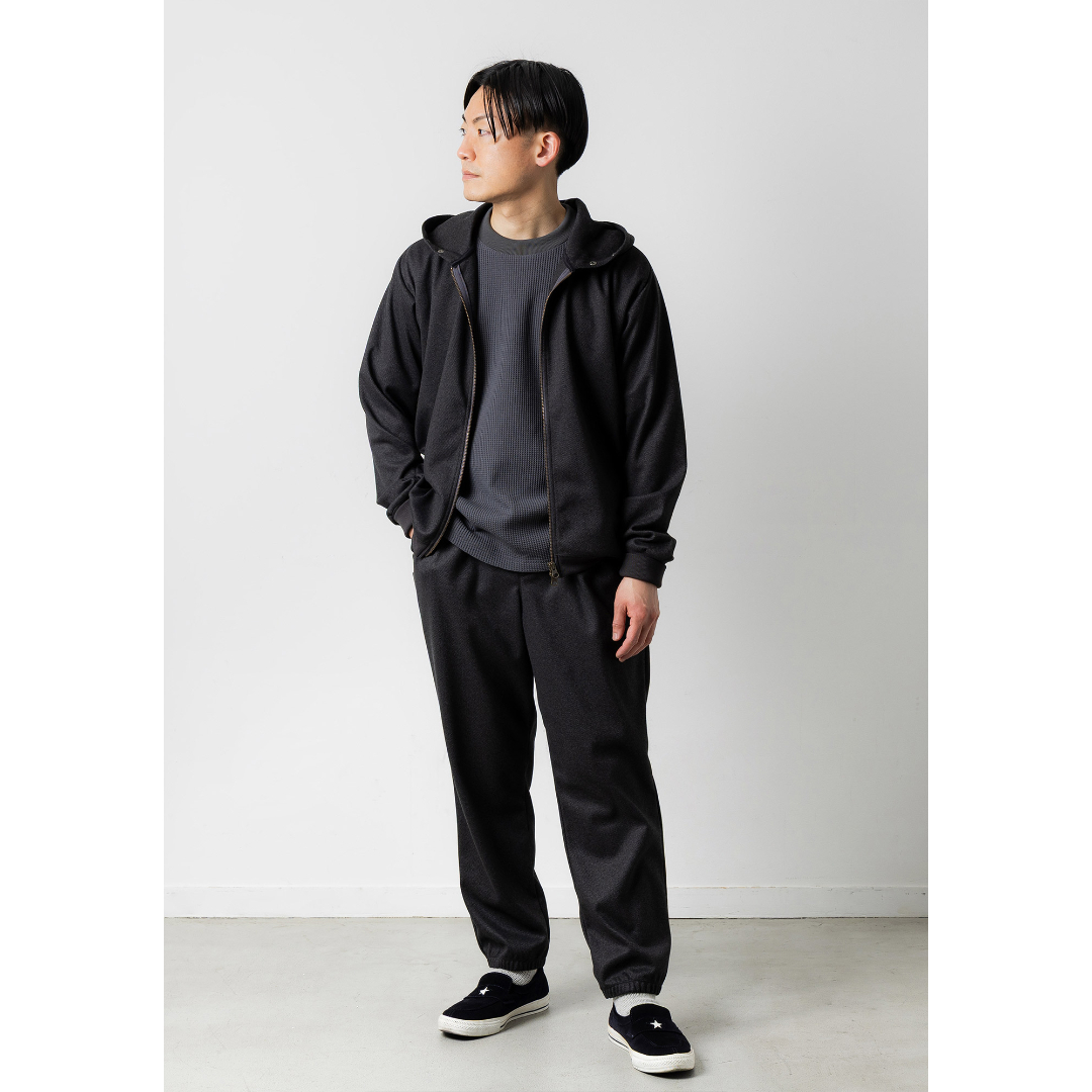 - ウールのような生地感だがポリエステル100%素材を使用したZIPパーカー。