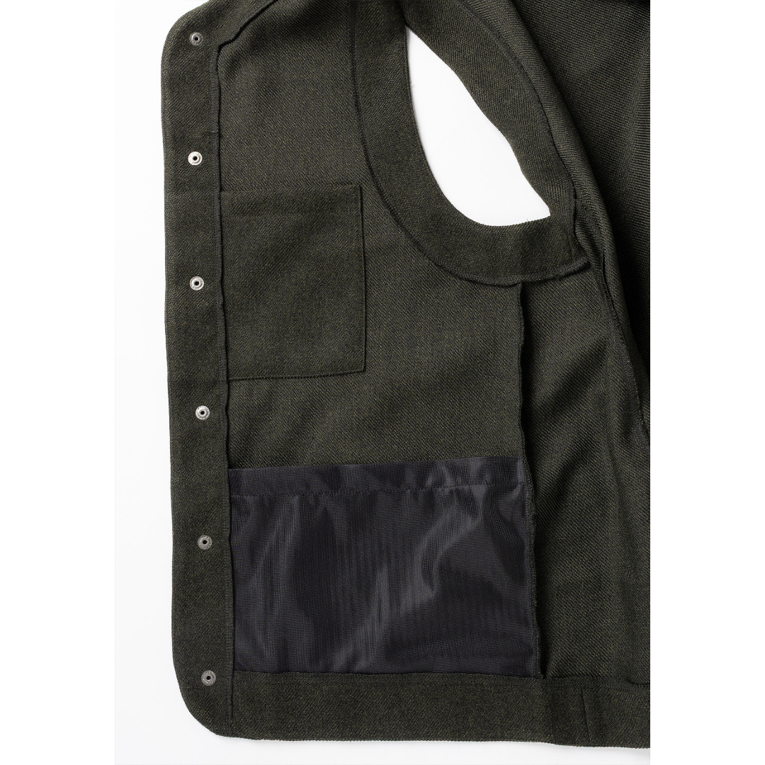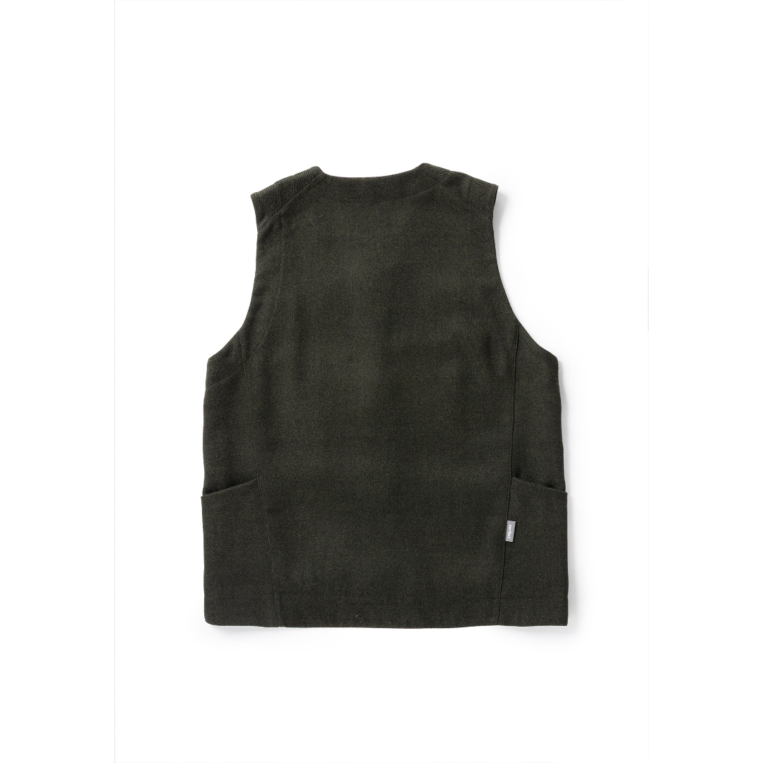 - ウールのような生地感だがポリエステル100%素材を使用したベスト。