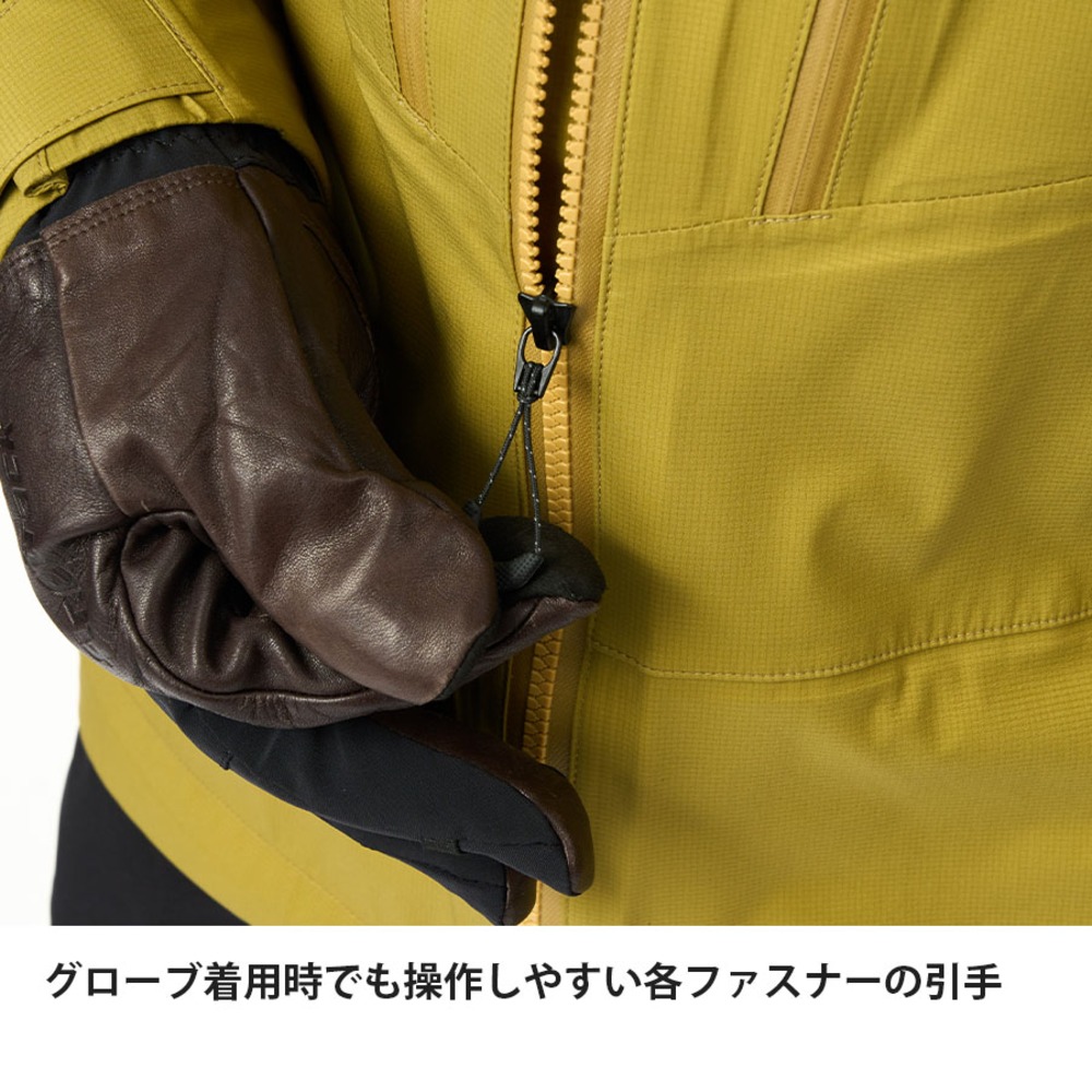 雪山に必要なギミックを各所に過不足なく配置しました。フードはヘルメットに対応可能、かつビーニーにもフィットさせられるアジャスタ機構を搭載。顔まわりを風雪から保護する高めの襟、寒冷地でも凍り付きにくい止水ビスロン®のフロントファスナーなど、少しステップアップした雪山にも対応可能なディテールです。
