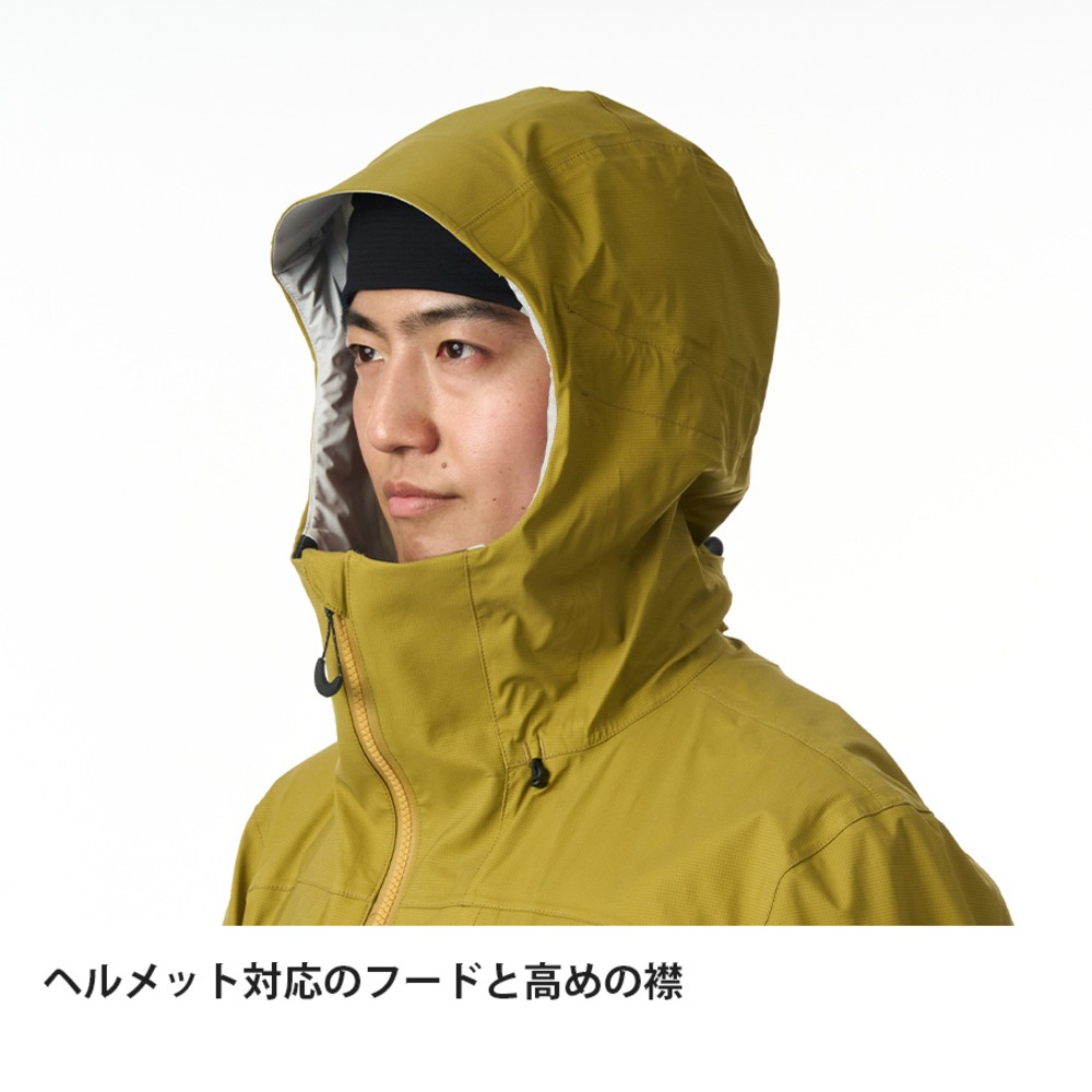 雪山に必要なギミックを各所に過不足なく配置しました。フードはヘルメットに対応可能、かつビーニーにもフィットさせられるアジャスタ機構を搭載。顔まわりを風雪から保護する高めの襟、寒冷地でも凍り付きにくい止水ビスロン®のフロントファスナーなど、少しステップアップした雪山にも対応可能なディテールです。