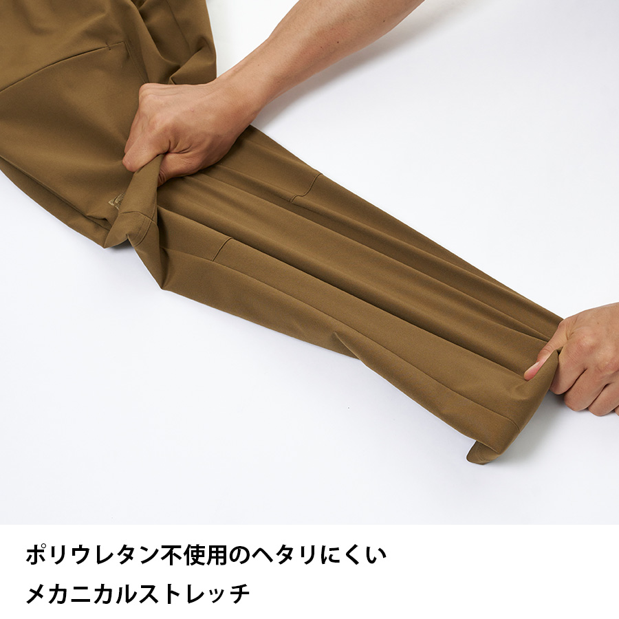 原糸の段階からきめ細かなクリンプ(糸自体をコイルのように伸縮させる)を持たせる特殊な製法のストレッチ糸を採用することで、ヘタリにくい「メカニカルストレッチ」を実現。タテヨコに伸びる生地が「動きやすさ」を生み出します。