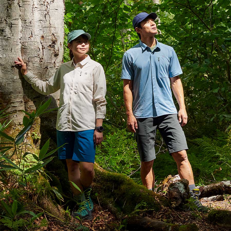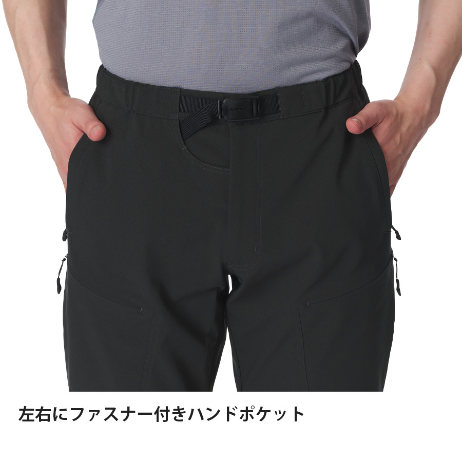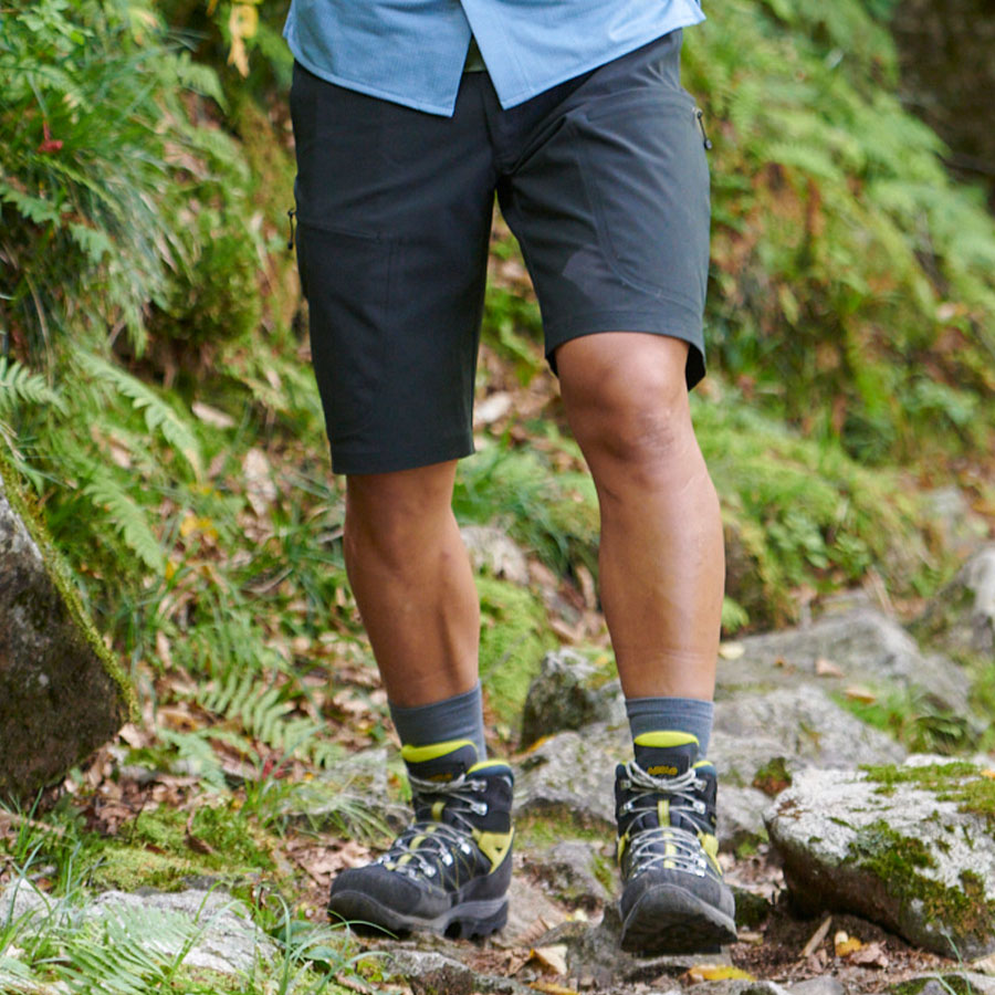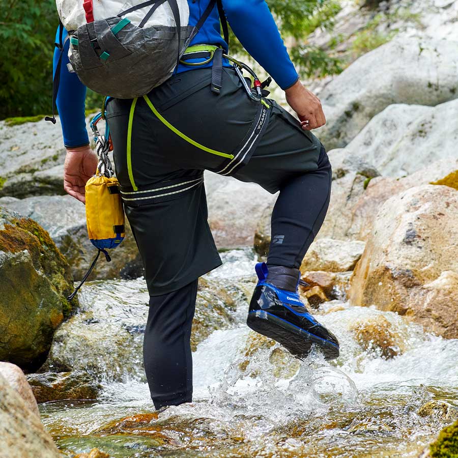 タテヨコに伸びて岩場や沢中などでの大きなアクションでもストレスフリーの動きやすさを備えます。