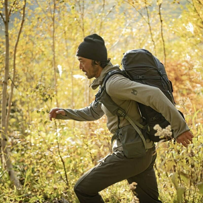 杢素材、洗練されたデザイン、アクセントとしてのポケット、リュックサックを背負った際に肩の縫い目を避ける裁断など、街で映えるデザイン性とアウトドアで活躍する機能性を両立しました。