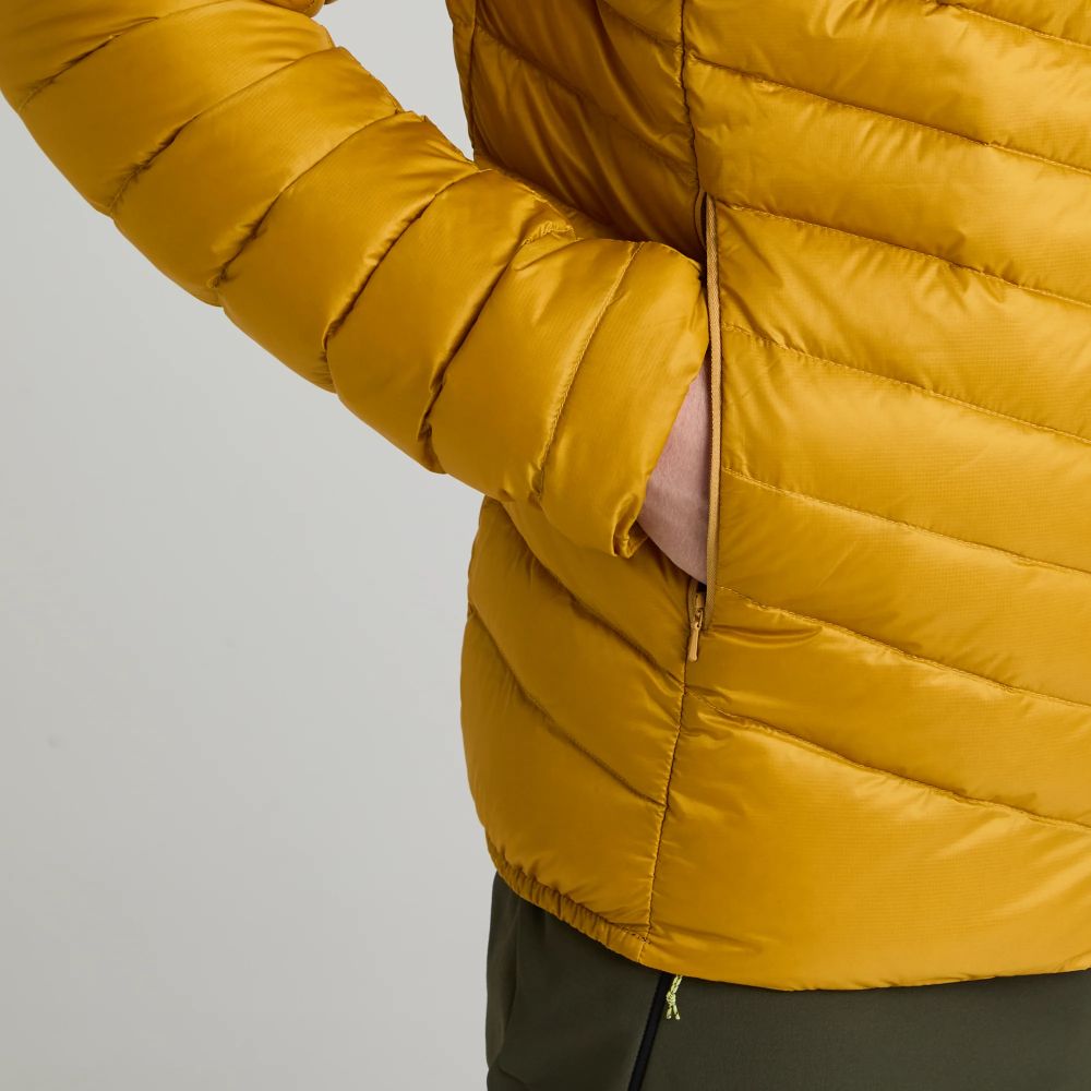 「ピュアホワイト」のムラードダックダウンを使用し、PFASフリーのNikwax DWR加工を施したこのジャケットは、濡れてもロフトと断熱性を維持し、従来のダウンよりも速乾性を備えています。