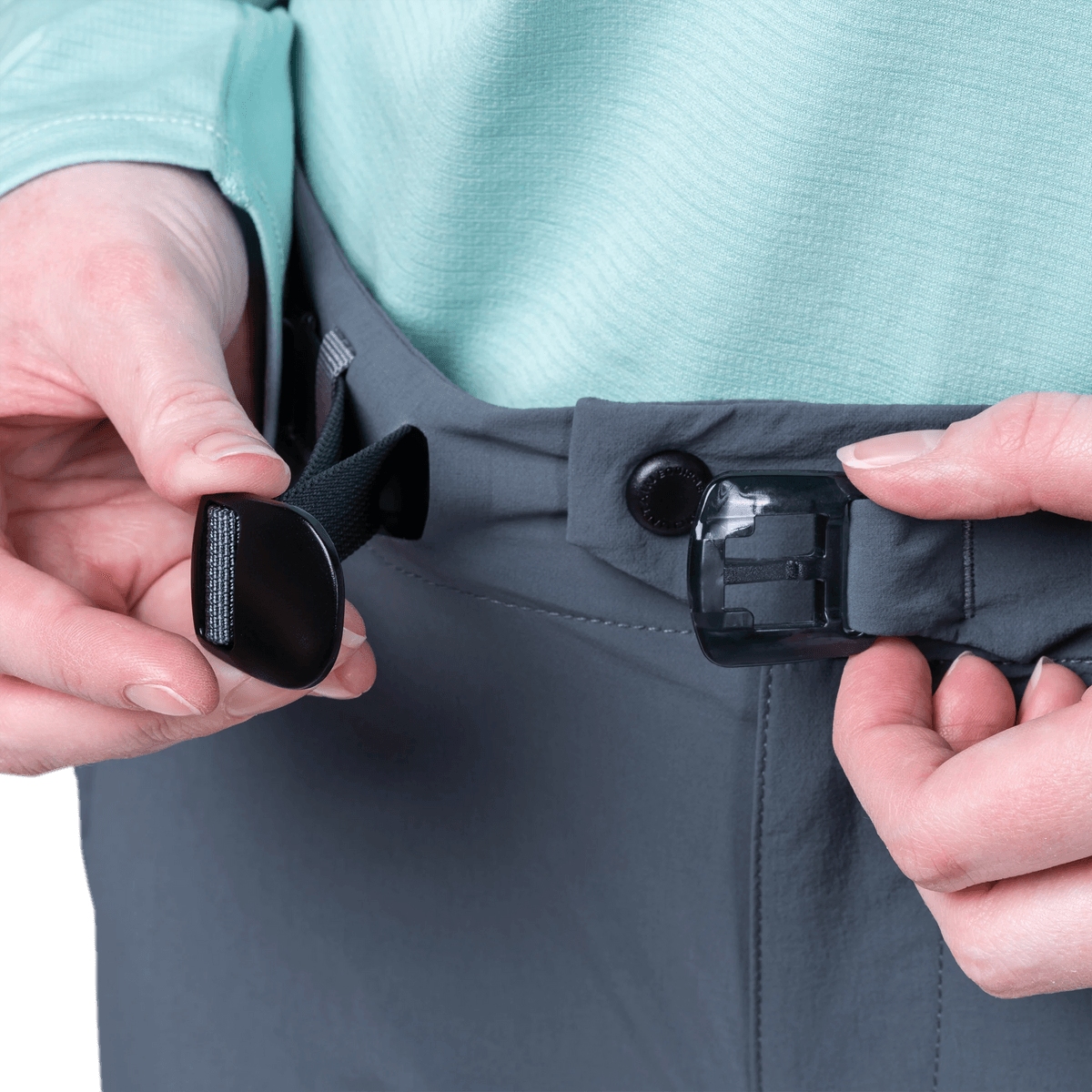 ウエストのダブルプレススタッド付きベルトは簡単に調節でき、パックやハーネスの下でも干渉しません。