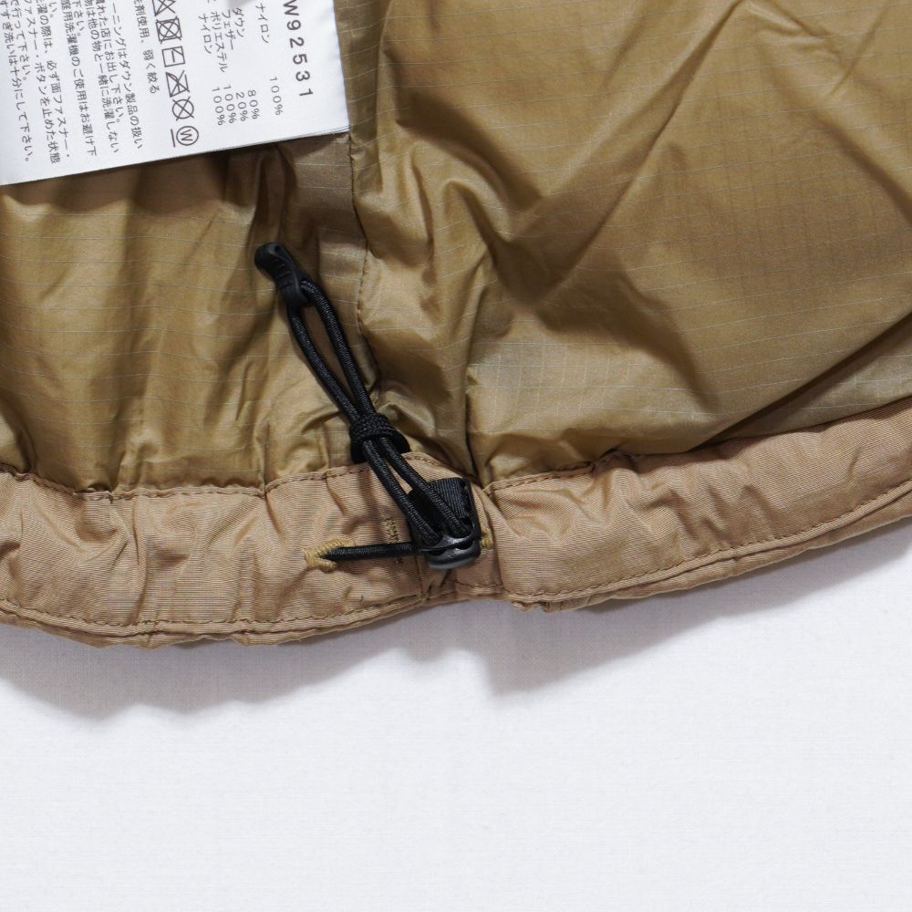 表地は、異形中空糸を使用した軽さが特徴のナイロン素材。コットンライクな自然な風合いで、はっ水性も備わっています。中わたには一部リサイクルダウンを採用し、ダウン特有のバッフル感と軽さを体感できます。裏地は、薄くすべりのよい12デニールのナイロンリップストップ。フードは取り外し可能です