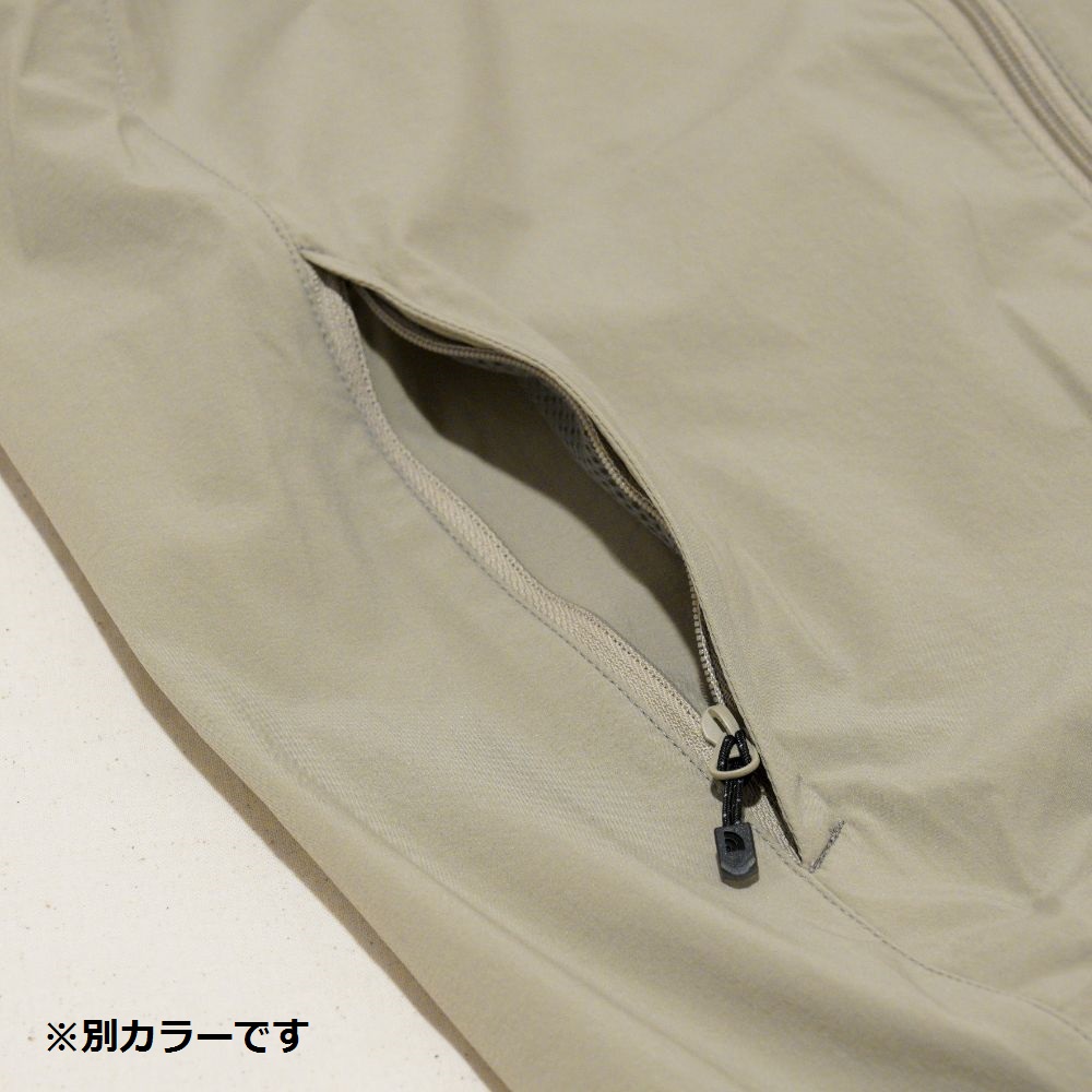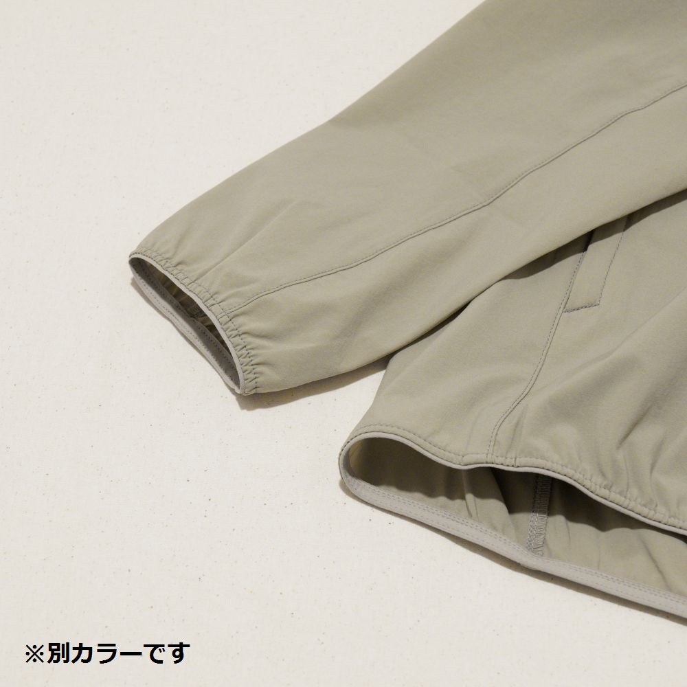 生地の高いストレッチ性に加え、立体裁断により、身体の動きにスムーズに追従します。はっ水加工を施し、多少の雨に対応。フードや袖口、裾はシンプルなバインダー仕様。フィット性の高いフードは、顔周りの視界を妨げにくい構造です。