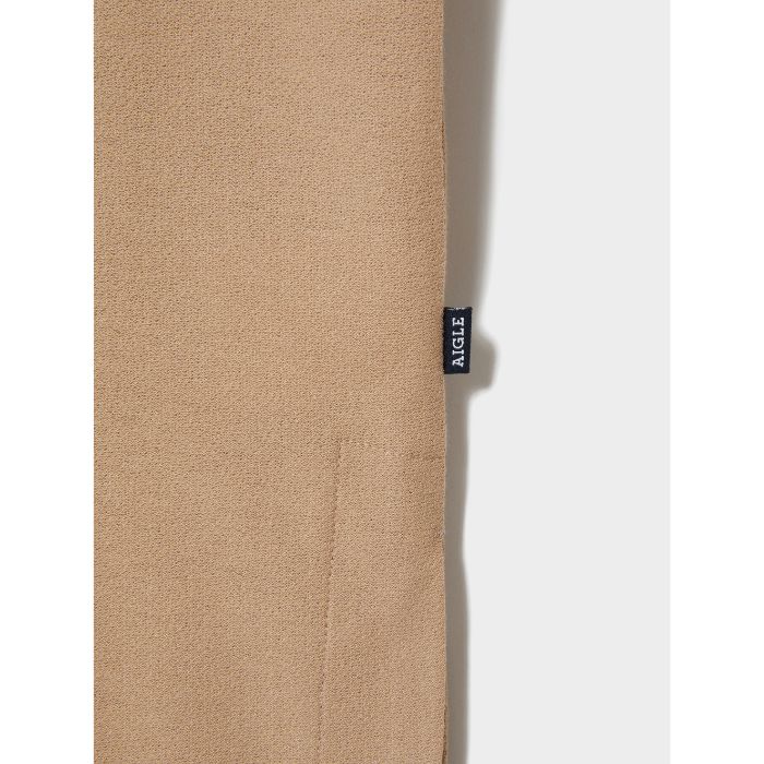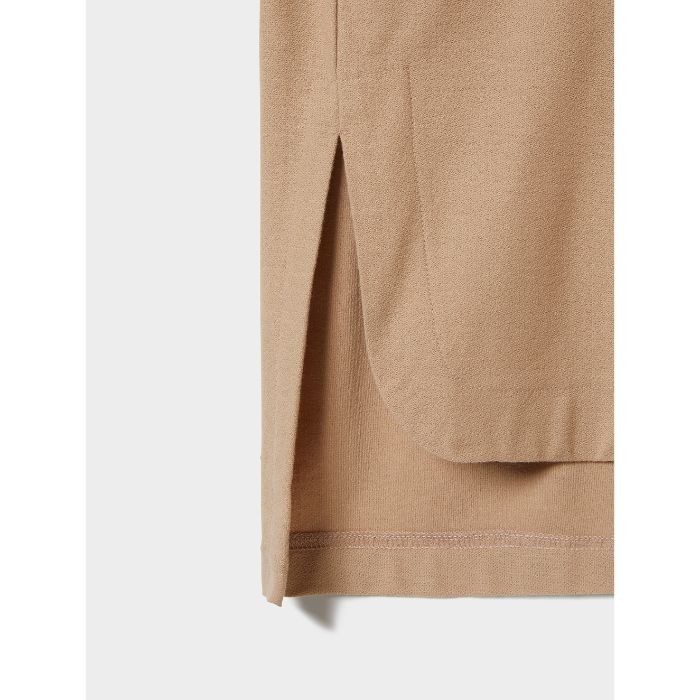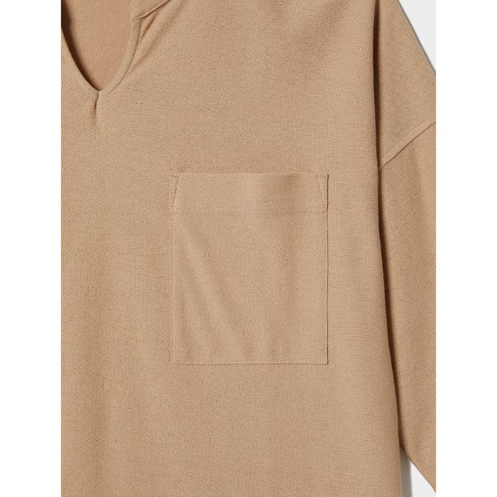 ざらっとした表面感が新鮮な、コットン×ポリエステルのブレンド梨地素材を採用。トレンドのビッグシルエットを、前襟にスリットを入れたスタンドカラーのスキッパーネックでアレンジした、洒落感あふれる1枚です。シンプルなプレーンカラーで、さまざまなスタイルにマッチする優れもの。
