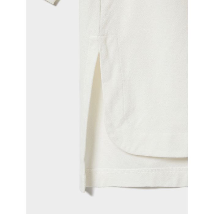 ざらっとした表面感が新鮮な、コットン×ポリエステルのブレンド梨地素材を採用。トレンドのビッグシルエットを、前襟にスリットを入れたスタンドカラーのスキッパーネックでアレンジした、洒落感あふれる1枚です。シンプルなプレーンカラーで、さまざまなスタイルにマッチする優れもの。