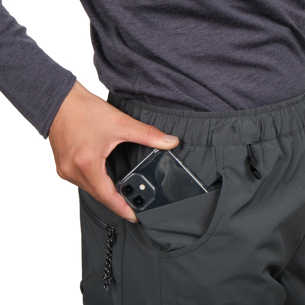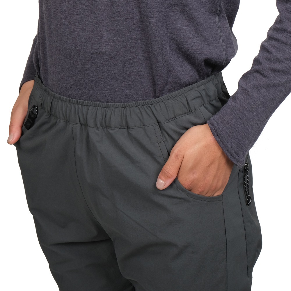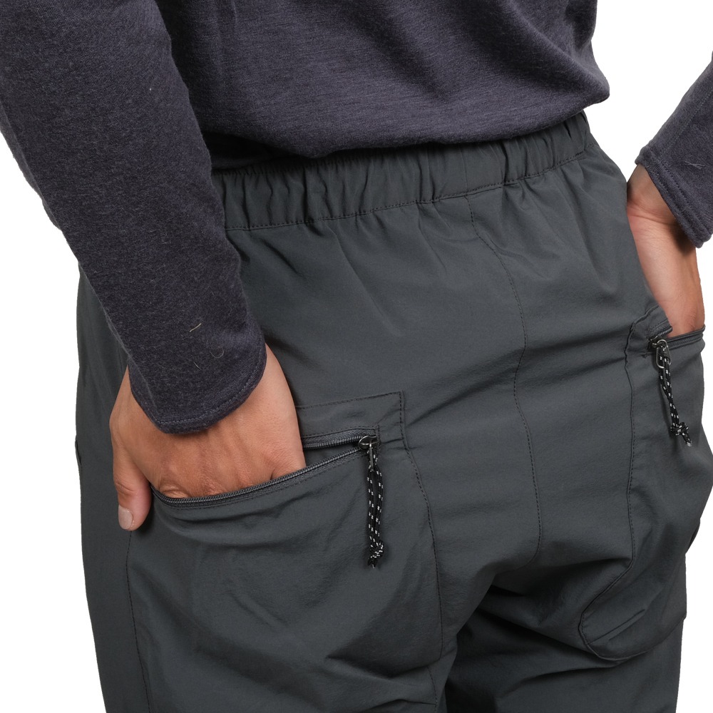 ベルトを排除してすっきりさせた腰周りはバックパックのヒップベルトを締めてもごろつきがなく、また、バックパックのヒップベルトを締めてもアクセスできるように前後のポケットの位置を低くしています。
