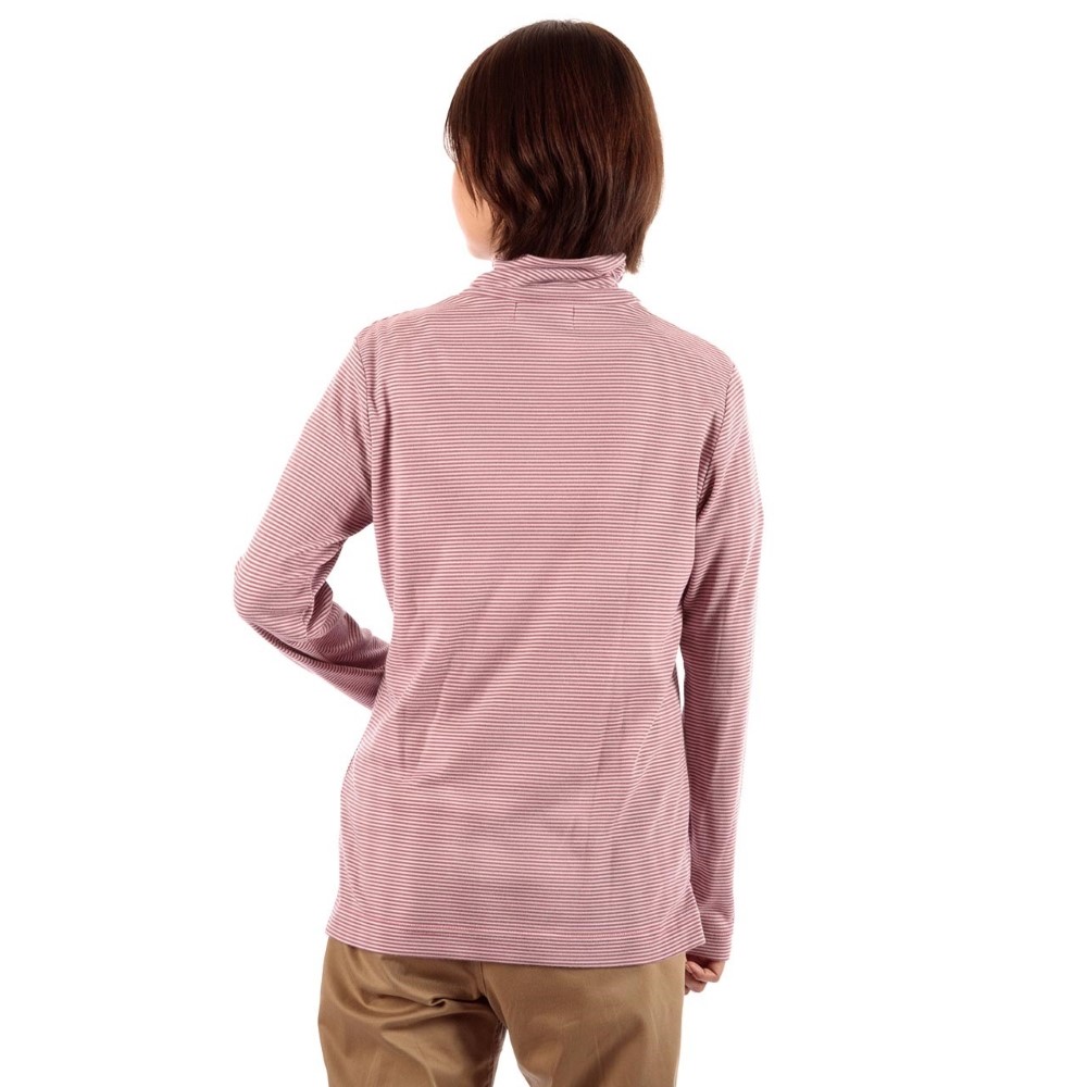 - ポリエステル100%で吸汗速乾性に優れながら光沢感が少なく、綿のようなソフトな風合いのハイネックシャツ。ギャザー入りの襟が首元を暖かく包み、女性らしい柔らかさを演出します。