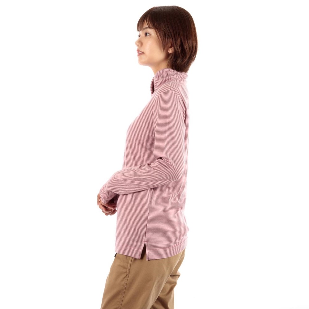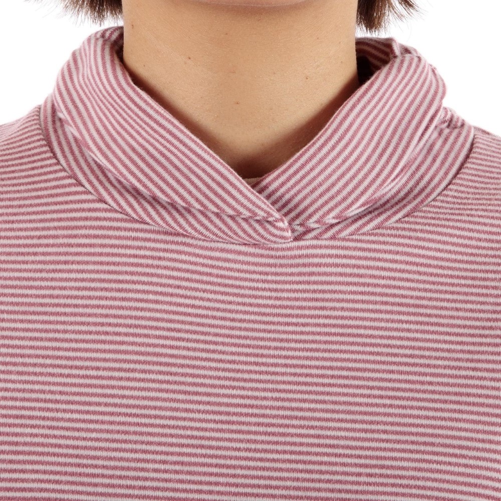 - ポリエステル100%で吸汗速乾性に優れながら光沢感が少なく、綿のようなソフトな風合いのハイネックシャツ。ギャザー入りの襟が首元を暖かく包み、女性らしい柔らかさを演出します。