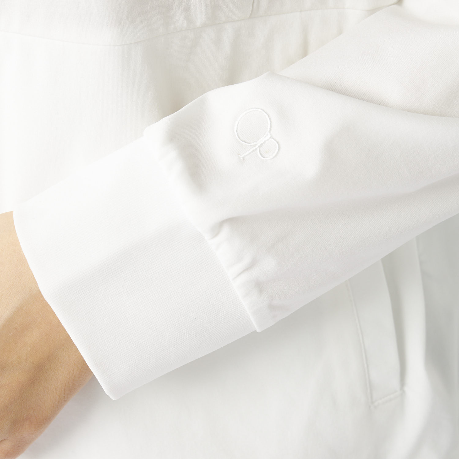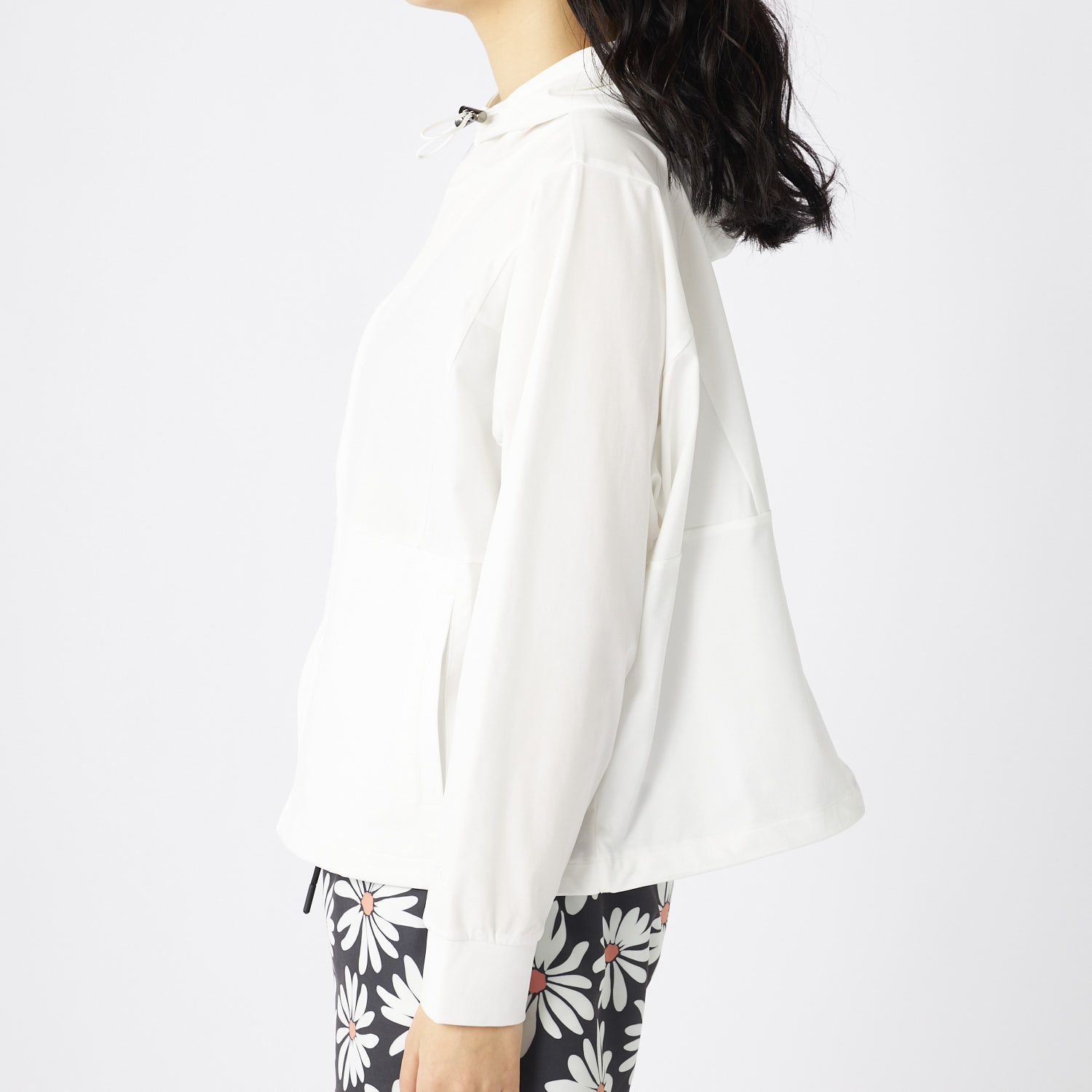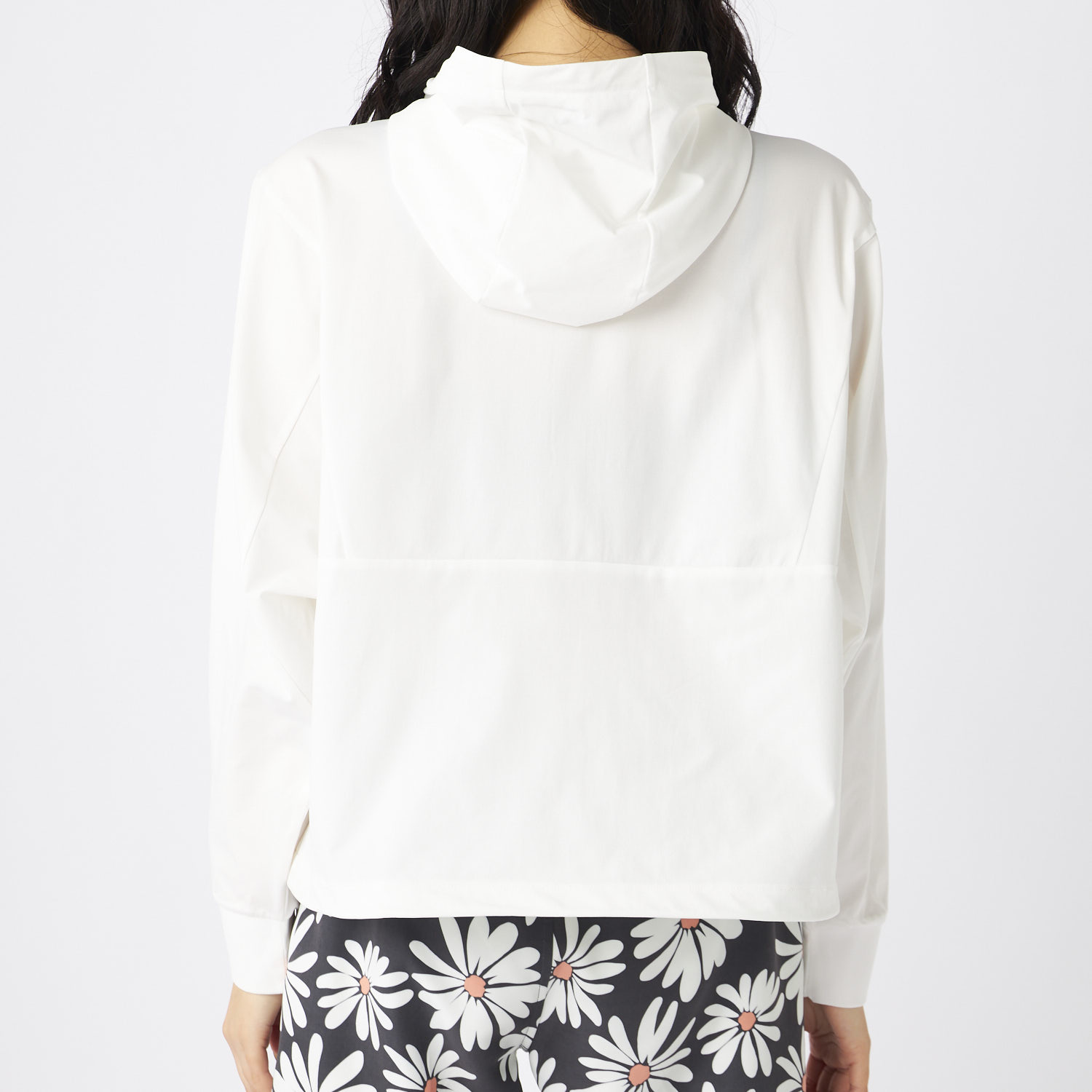 - 綿ライクなポリエステル100%の機能素材を使ったUVパーカー。首元やフードの立体感、見頃や袖の切り替えで、シンプルな中にもデザイン性をプラス。裾にはドローコード付きで、丈感を調整していただけます。
