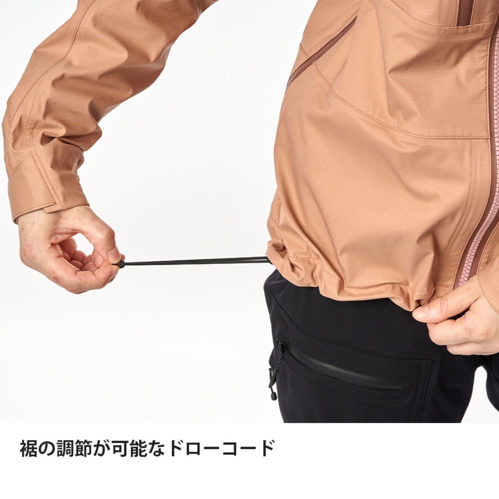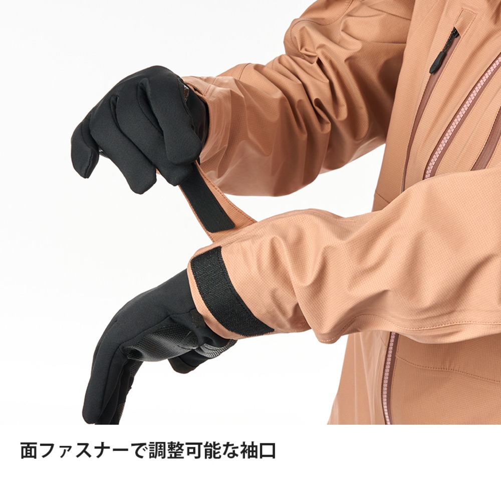 雪山に必要なギミックを各所に過不足なく配置しました。フードはヘルメットに対応可能、かつビーニーにもフィットさせられるアジャスタ機構を搭載。顔まわりを風雪から保護する高めの襟、寒冷地でも凍り付きにくい止水ビスロン®のフロントファスナーなど、少しステップアップした雪山にも対応可能なディテールです。