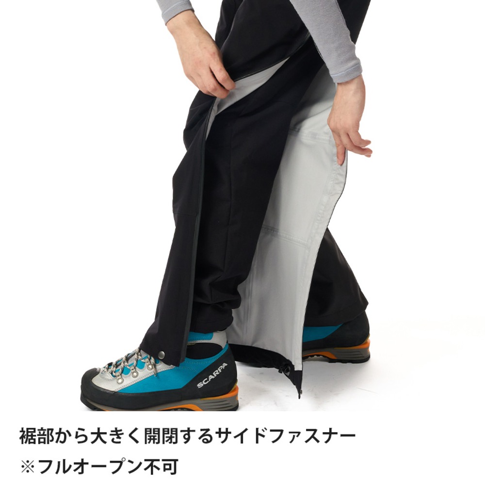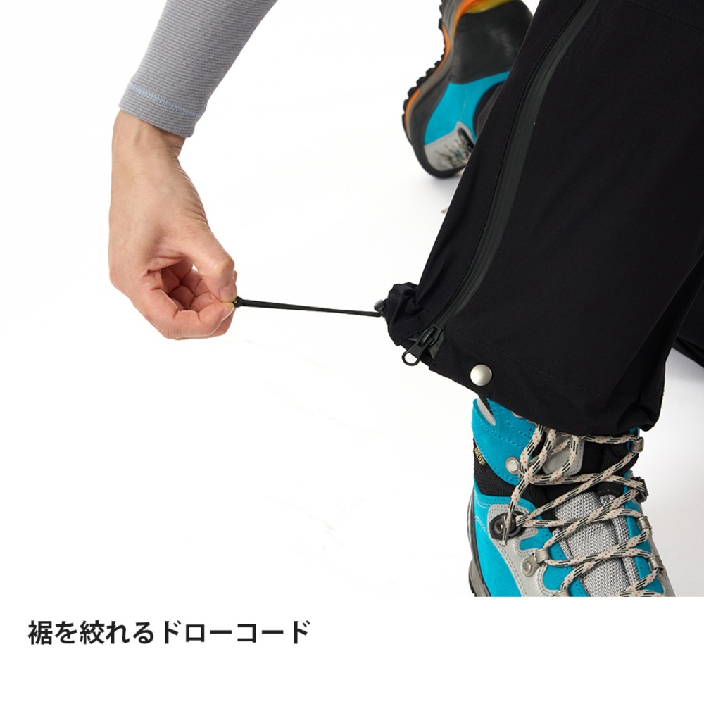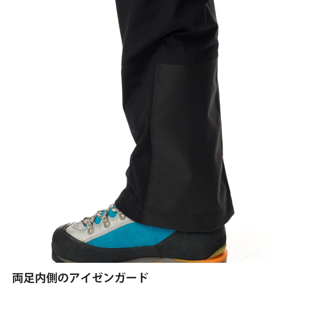 雪山に必要なギミックを各所に過不足なく配置しました。アイゼン使用時の擦れに強いアイゼンガード、グローブを付けたまま調整が容易なウエスト調整機構など、少しステップアップした雪山にも対応可能なディテールです。