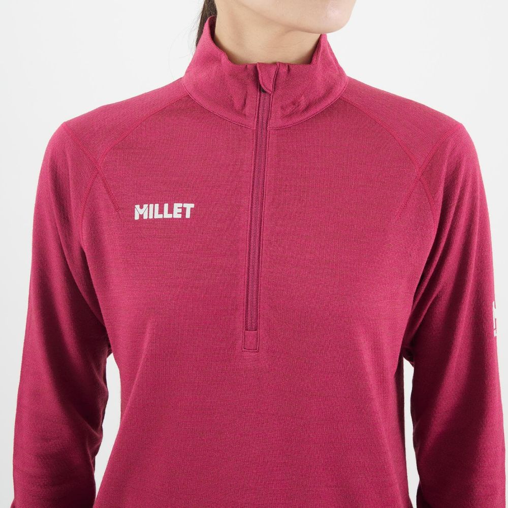 スタンドカラーと長めのフロントハーフジップは温度調節がしやすく、袖口にはより保温性の高めるサムループが付いています。