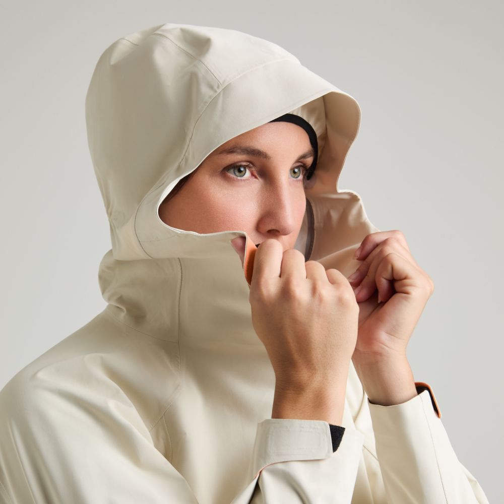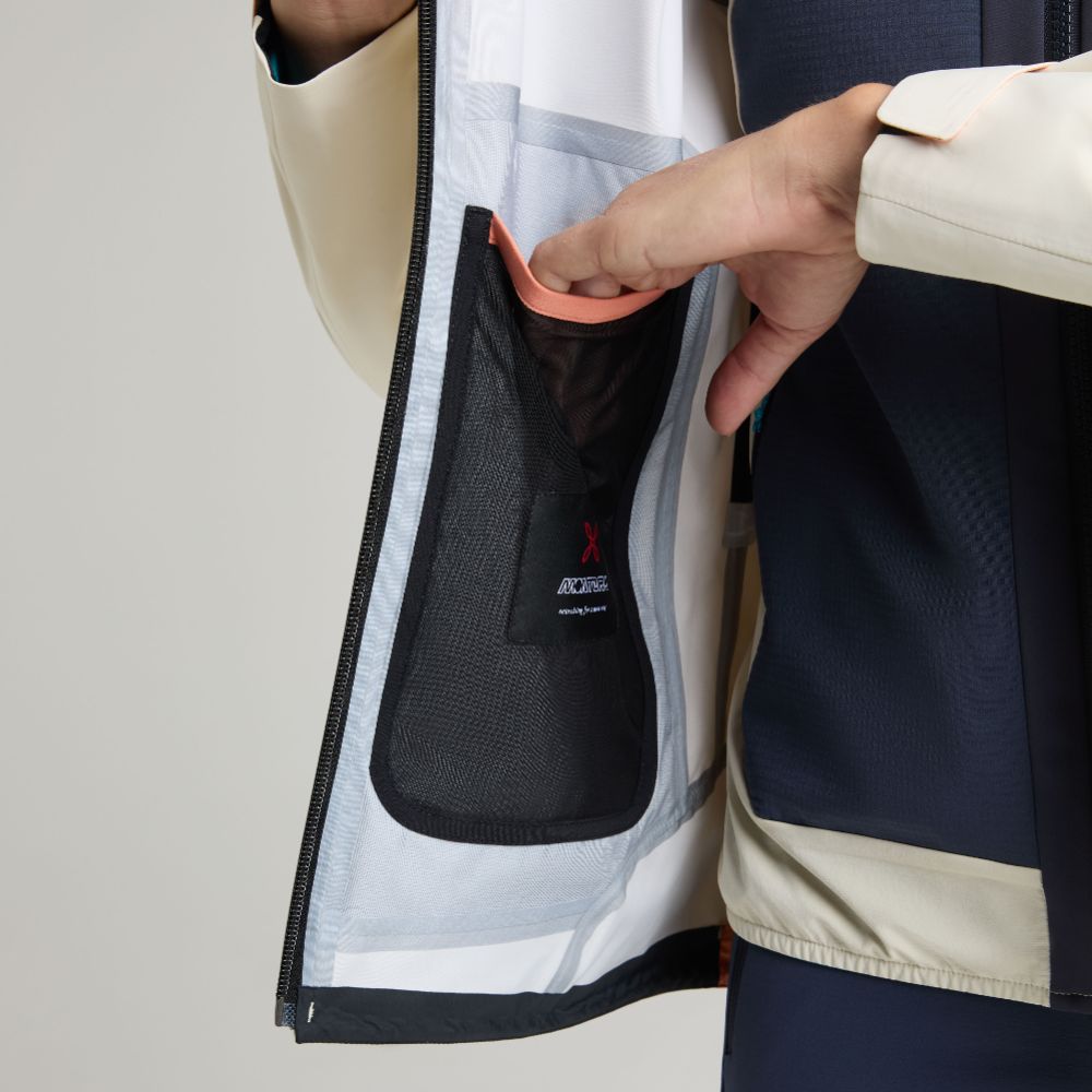 脇下のジッパー付きベントは、ミドルレイヤーへの素早いアクセスを可能にし、調節可能なフード、袖口、裾は、体にぴったりとフィットする快適な着心地を提供します。